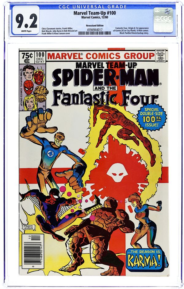 Ended Aug 4 2025 Bid History 8 bids Winning Bid $21 Newsstand Edition. Giant-size issue. "And Introducing Karma! She Possesses People!" Guest-starring Spider-Man and the Fantastic Four. Script by Chris Claremont. Art by Frank Miller (breakdowns) and Bob Wiacek (finishes). Cover by Frank Miller and Klaus Janson. The Fantastic Four are attending an upscale reception in New York's financial district, when suddenly the Spectacular Spider-Man crashes the party! The web-slinger wants to rescue two Vietnamese children in attendance, but instead ends up battling the FF! What has possessed the wall-crawler to do this? After comparing notes, the fabulous foursome and Spider-Man realize that they are caught in the middle of a child custody battle between two high-powered telepaths! And on the East River waterfront, the life-and-death showdown takes place! First appearance of Karma (Xi'an Coy Manh). Cameo appearances by Colossus, Storm, Wolverine, and Professor Xavier. (Notes: Karma appears next in Marvel Graphic Novel 4. This story was reprinted in Marvel Tales 250 and also in The Complete Frank Miller Spider-Man.) Second story: "Cry--Vengeance!" Guest-starring Storm and the Black Panther. Plot by Chris Claremont and John Byrne. Script by Chris Claremont. Art by John Byrne (breakdowns) and Bob McLeod (finishes). After surviving an assassination attempt, Storm learns that an old foe from days gone by has come back for revenge. Ororo visits the Wakanda embassy to tell T'challa that Andreas De Ruyter is in New York. And just as they did many years ago on the African continent, the Black Panther and Storm team up to fight the evil of De Ruyter! 52 pages. Cover price $0.75. Grade: CGC 9.2 explanation of grade Condition: Used (collectible)
