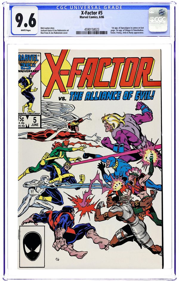 Ended Sep 29 2025 Bid History 16 bids Winning Bid $46 Direct Edition. "Tapped Out!" Part 1 of 2. 1st appearance of Apocalypse (shadowed cameo). Story by Bob Layton. Art by Jackson Guice and Joe Rubinstein. Cover by Ron Frenz and Joe Rubinstein. It's a classic super-hero/super-villain throw-down when X-Factor must battle the Alliance of Evil (Frenzy, Tower, Stinger, and Timeshadow) for the life of a mutant. Featuring a new menace by the name of Apocalypse, an evil mutant who will become a major thorn in the sides of the X-Men and X-Factor. Cover price $0.75. Grade: CGC 9.6 explanation of grade Condition: Used (collectible)