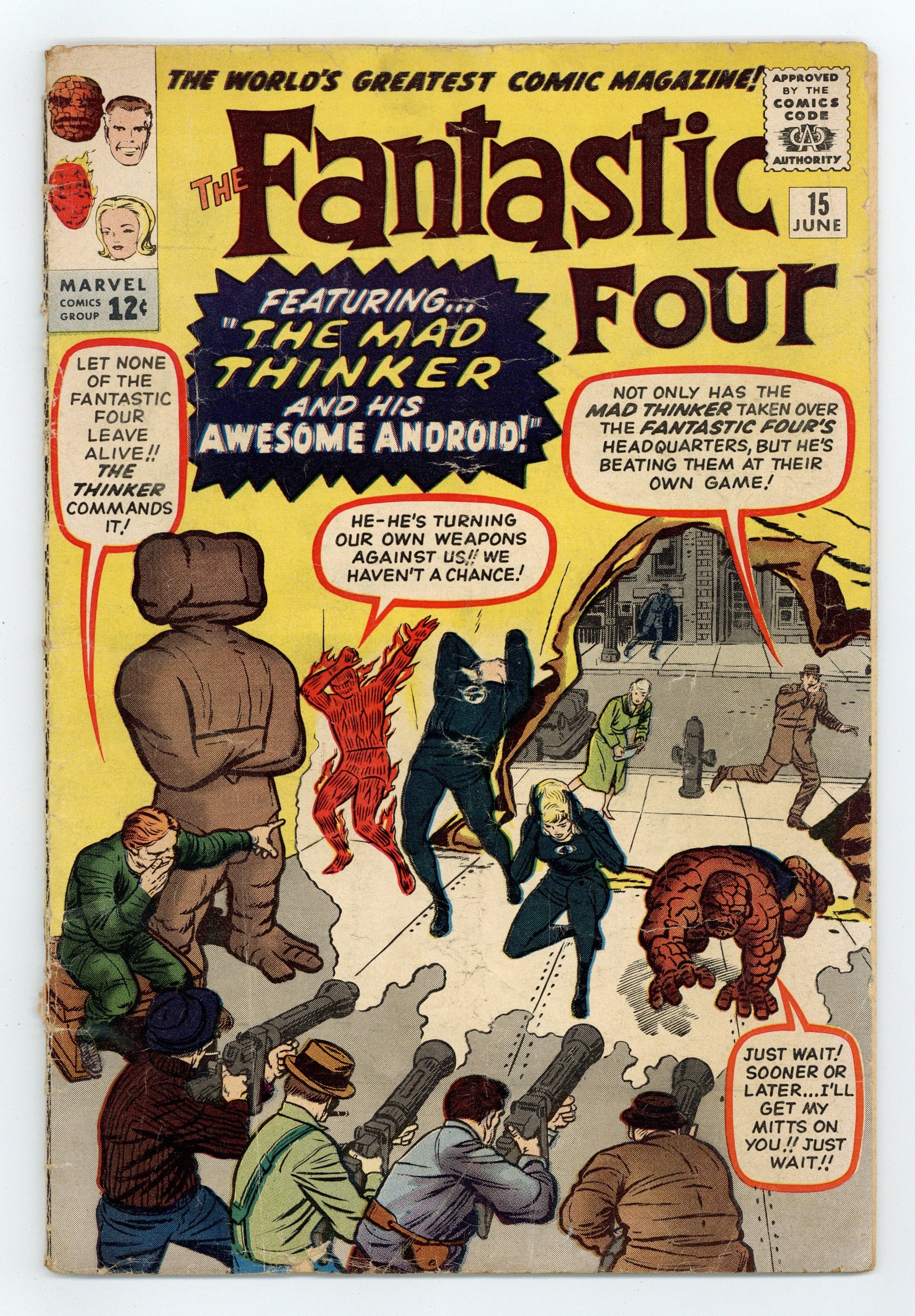 Ends Dec 8 8:16 PM CST Bid History 16 bids Current Bid $105 Your Secret Max Bid If you'd like to bid, please log in or register. Cover pencils by Jack Kirby, inks by Dick Ayers. First appearance of the Mad Thinker in "The Fantastic Four Battle the Mad Thinker and His Awesome Android!", script by Stan Lee, pencils by Jack Kirby, inks by Dick Ayers; The Mad Thinker has summoned gang leaders to try to become the king of New-York; To achieve his goal, he must defeat the Fantastic Four; So he makes sure they are all offered interesting opportunities; While they disband, the Thinker uses the Baxter Building to build his Awesome Android. The Fantastic Four Pin-Up Page, script by Stan Lee, pencils by Jack Kirby, inks by Dick Ayers. Half-page ads for Sgt. Fury # 1 and the next issue of Fantastic Four. Fantastic Four Fan Clubs ad. 36 pgs. $0.12. Cover price $0.12. Grade: GD 2.0 explanation of grade Condition: Used (collectible)