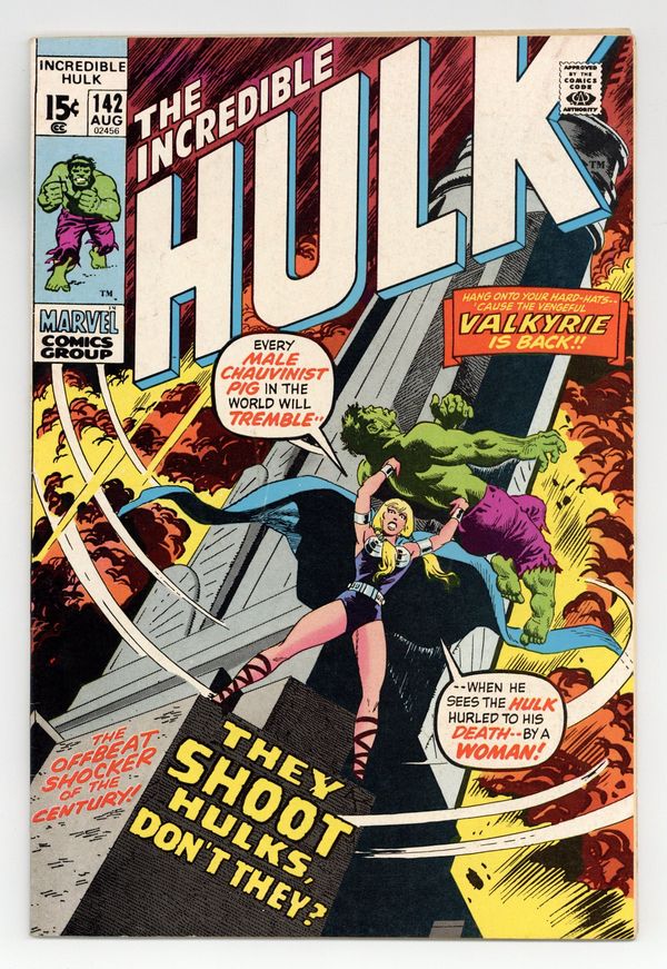 Cover pencils by Herb Trimpe, inks by John Severin. They Shoot Hulks, Don't They?, script by Roy Thomas, pencils by Herb Trimpe, inks by John Severin; The Hulk is the focus of a social event as the Parringtons bring him to a party but their women's lib daughter is given the powers of the Valkyrie by the Enchantress and battles the jade giant. House ad for Conan the Barbarian #8, pencils by Barry Smith. Cameo by author Tom Wolfe. (This story is inspired in part by Wolfe's novel "Radical Chic.") 36 pgs. $0.15. Cover price $0.15. Grade: VG+ 4.5 explanation of grade Condition: Used (collectible)