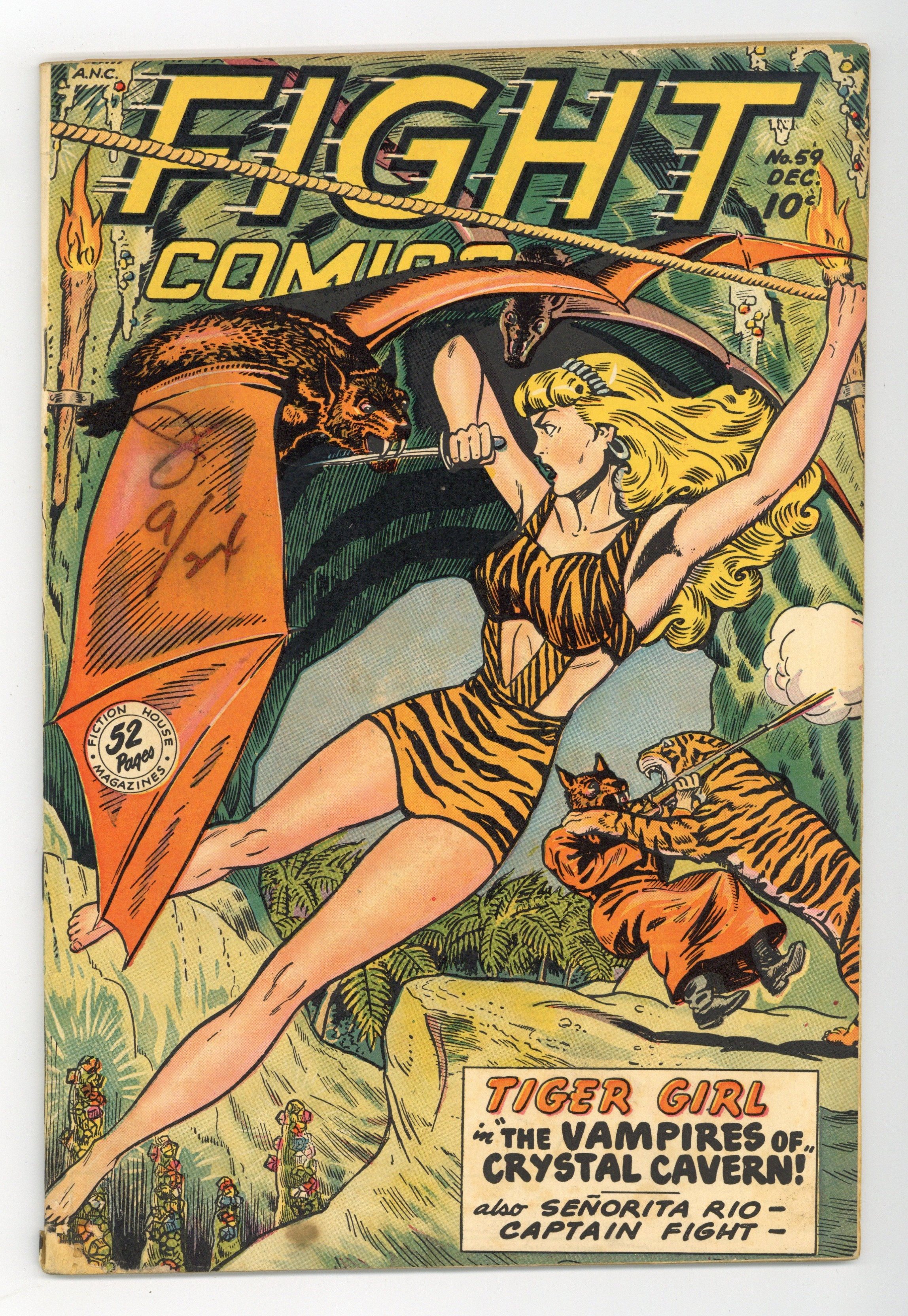 Cover by Joe Doolin and others. Edited by Joseph V. Daffron and Jerry Iger. Stories and art by Jack Kamen, Robert Webb, John Forte, and George Evans. A combat-themed anthology from Fiction House that featured early work from many future comics legends (often uncredited) in the Eisner-Iger Shop. A phony colonel promotes intertribal warfare to benefit his trading scheme, but first he must get rid of Tiger Girl; A phony treasure map brings Captain Fight into battle with Captain Bones; Senorita Rio joins forces with a masked man to retrieve a downed pilot with biological weapons data. Another vibrant Tiger Girl cover. Tiger Girl; Risks, Unlimited starring Rip Carson; Kayo Kirby; World Adventurers - Grizzly Adams; Hooks Devlin; Senorita Rio; Captain Fight. 52 pages, Full Color. Cover price $0.10. Grade: VG 4.0 explanation of grade Condition: Used (collectible)