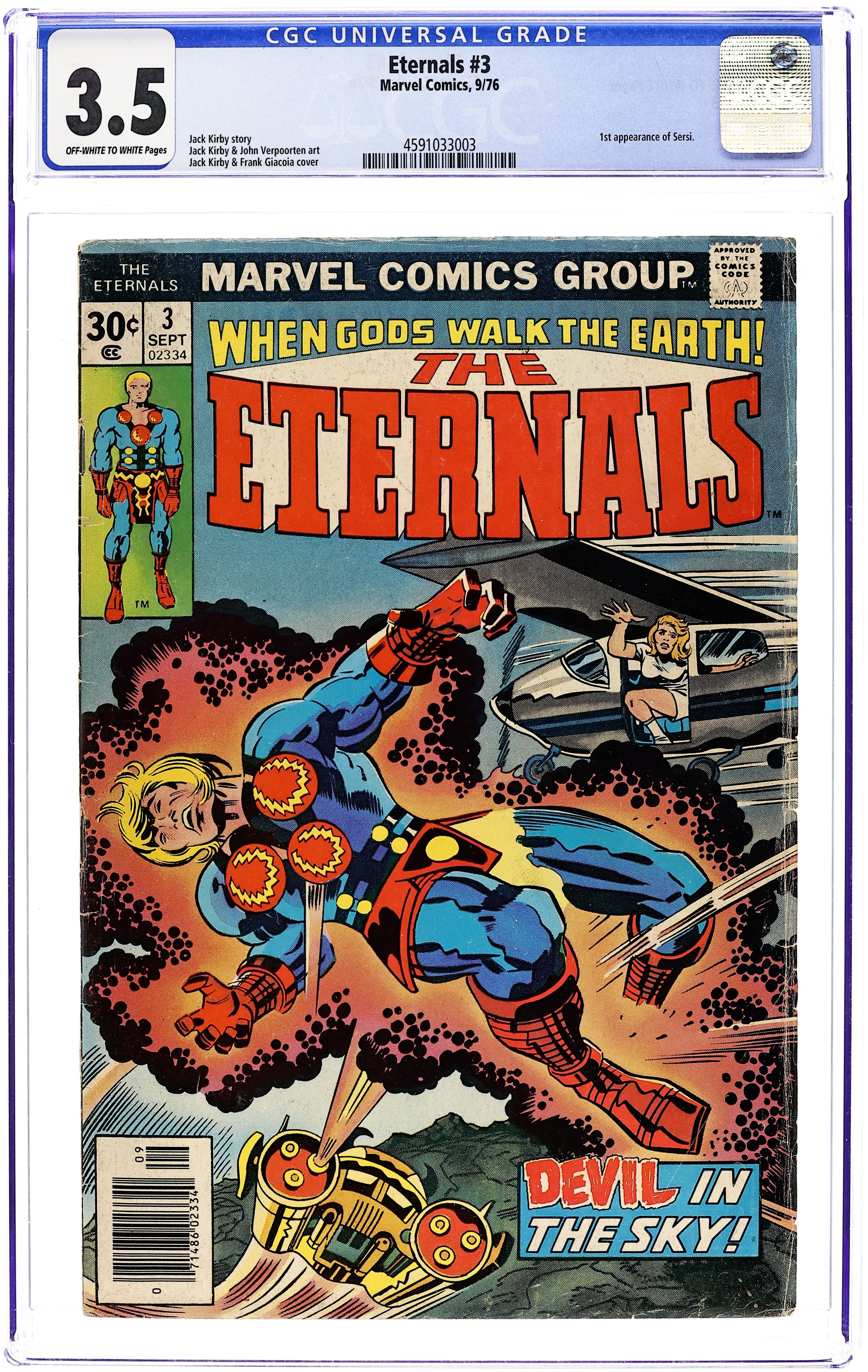 "The Devil in New York!" Written by Jack Kirby. Pencils by Jack Kirby. Inks by John Verpoorten. The hidden chapters in the history of man are quickly being revealed. The Celestials have returned! Untouched for thousand years, a large crypt in an Incan ruin has discharged a living flight crew. As Margo's head spins from all the fantastic sights she has seen, sights no mortal before has seen, Ikaris introduces her to the fabulous Eternal beauty known as Sersi. Meanwhile, if the gods haves returned, can the monsters be far behind. The beastly Deviants, the sworn enemy of the Eternals and mankind, prepare to attack! Notes: 1st appearance of Sersi. Letter to the editor from comics writer Ralph Macchio. Cover price $0.30. Grade: CGC 3.5 explanation of grade Condition: Used (collectible)