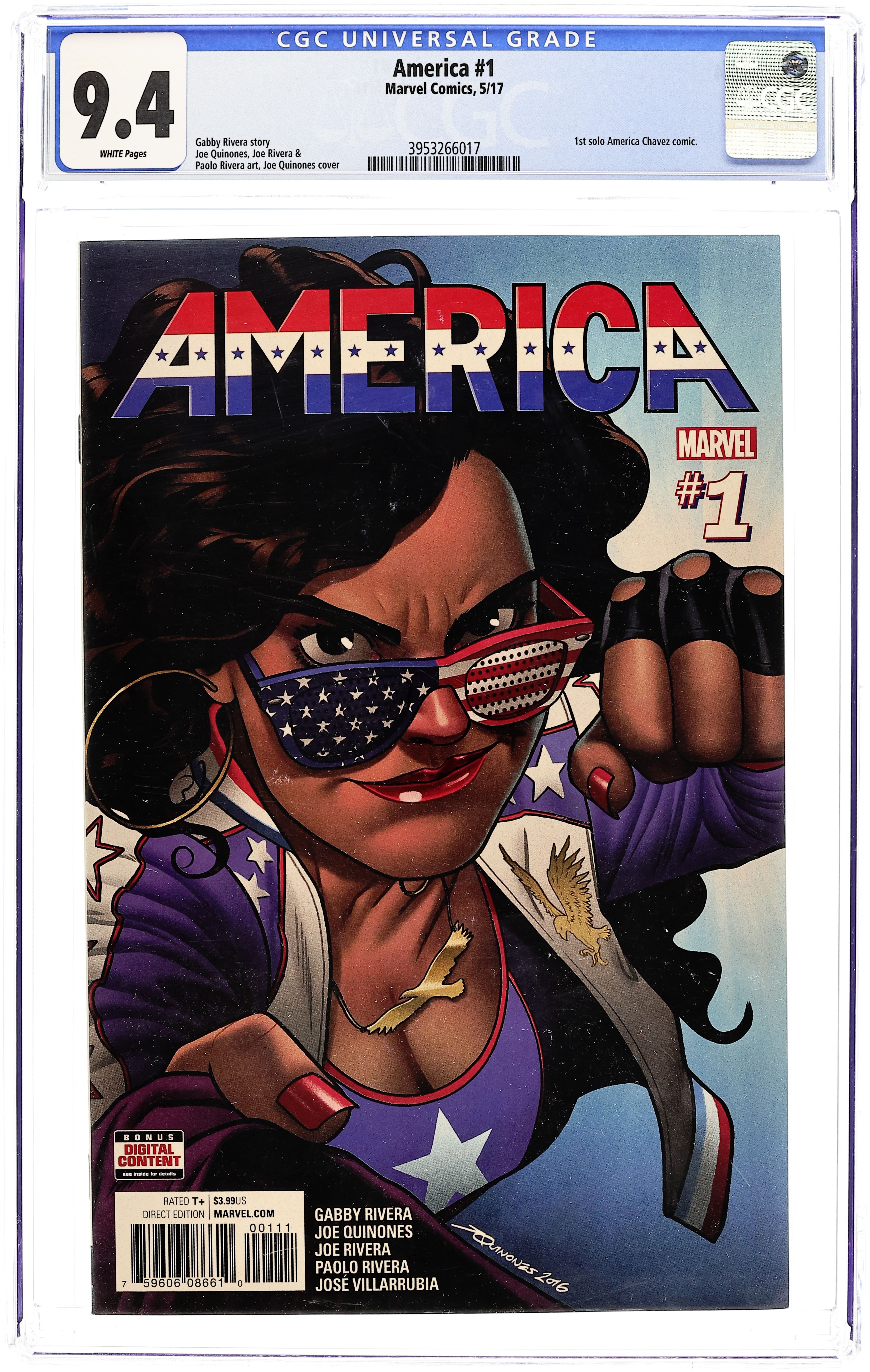 Written by Gabby Rivera. Art and Cover by Joe Quinones. At last! Everyone's favorite no-nonsense powerhouse, America Chavez, gets her own series! Written by critically-acclaimed YA novelist Gabby Rivera (Juliet Takes A Breath) and drawn by all-star artist Joe Quinones (HOWARD THE DUCK), Marvel Comics' brand new AMERICA series shines a solo spotlight on the high-octane and hard-hitting adventures of the one and only America Chavez! America has always been uncontestably awesome, and as the newly appointed leader of the Ultimates, she's now officially claimed her place as the preeminent butt-kicker of the Marvel Universe! But while leading a team of heroes and punching out big bads is great and all, it doesn't really leave much time for self-discovery… So what's a super-powered teenager do when she's looking for a little fulfillment? She goes to college! She just has to stop an interdimensional monster or two first, plus shut down a pesky alien cult that's begun worshipping her exploits! 28 pages, full color. Rated T+ Cover price $3.99. Grade: CGC 9.4 explanation of grade Condition: Used (collectible)