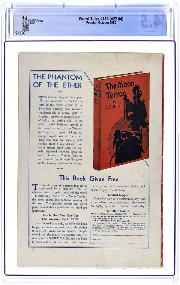 Ended Oct 13 2025 Bid History 33 bids Winning Bid $5,500 Volume 22, Issue 4 - October 1933. Edited by Farnsworth Wright. Horror and Fantasy stories in the pulp style. 6.75-in. x 10-in.; 128 newsprint pages, text (with B&W illustrations). Cover price $0.25. Grade: CGC 4.5 explanation of grade Condition: Used (collectible)