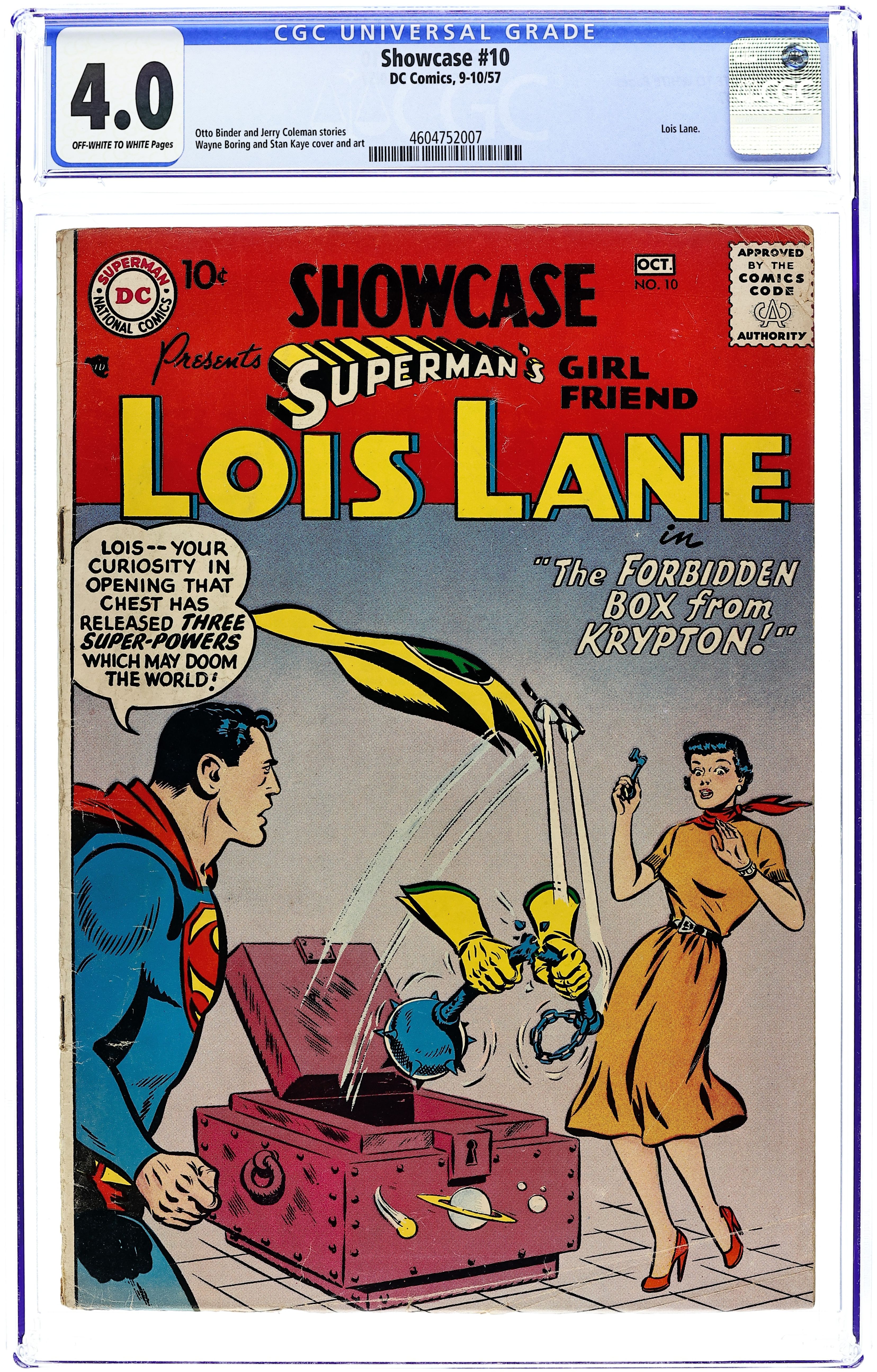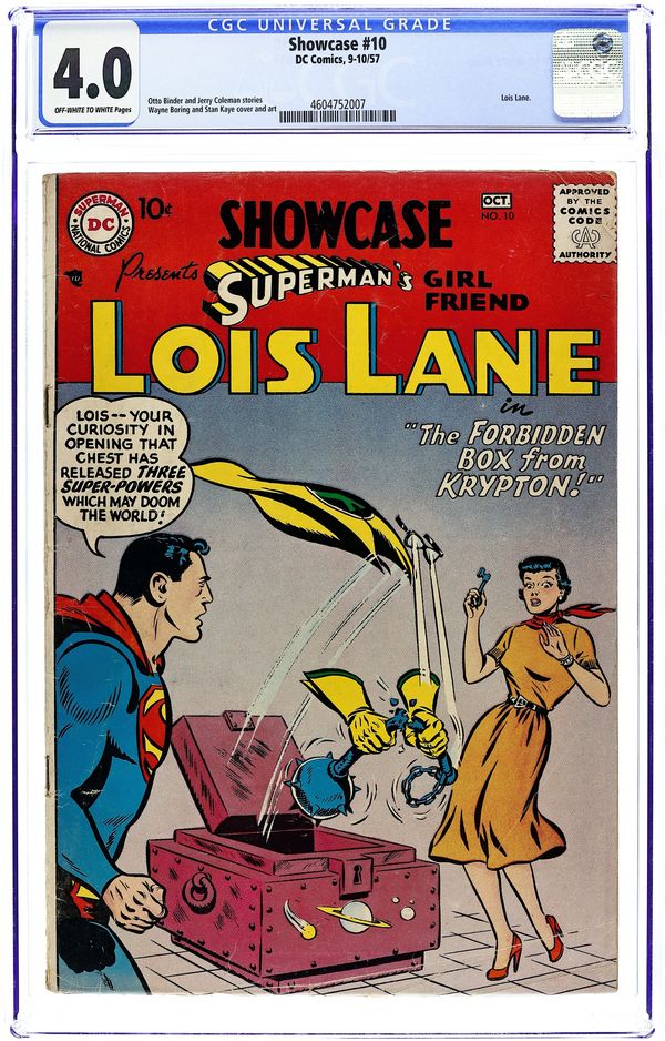 Ended Oct 13 2025 Bid History 10 bids Winning Bid $221 Cover pencils by Wayne Boring, inks by Stan Kaye. Lois Lane's 2nd and last appearance in Showcase (after this she gets her own title, Superman's Girlfriend, Lois Lane). The Jilting of Superman, script by Otto Binder, pencils by Wayne Boring, inks by Stan Kaye; Lois tries to make Superman jealous by pretending to be married to someone else. Danger: Prejudice at Work public service announcement, script by Jack Schiff, art by Ruben Moreira. The Sightless Lois Lane, script by Jerry Coleman, pencils by Wayne Boring, inks by Stan Kaye. The Forbidden Box from Krypton, script by Otto Binder, pencils by Wayne Boring, inks by Stan Kaye; Lois discovers a box of Kryptonian artifacts that give her super powers. 36 Pages, Full Color. Lois Lane's 2nd and last appearance in Showcase (after this she gets her own title!). Cover price $0.10. Grade: CGC 4.0 explanation of grade Condition: Used (collectible)