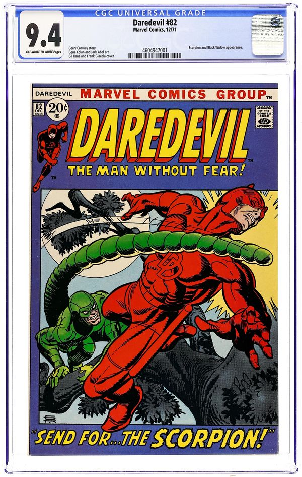First 20-cent cover price. Cover pencils by Gil Kane, inks by Frank Giacoia. Now Send...The Scorpion, script by Gerry Conway, pencils by Gene Colan, inks by Jack Abell; Mr. Kline sends the Scorpion to capture the Black Widow, knowing that it will lure DD into battle; Foggy confronts Kline and discovers that his blackmailer is a robot; During the fight, it appears that the Widow allows Scorpion to fall to his death provoking an accusing outcry from a bystander. 32 pgs. Cover price $0.20. Cover price $0.20. Grade: CGC 9.4 explanation of grade Condition: Used (collectible)