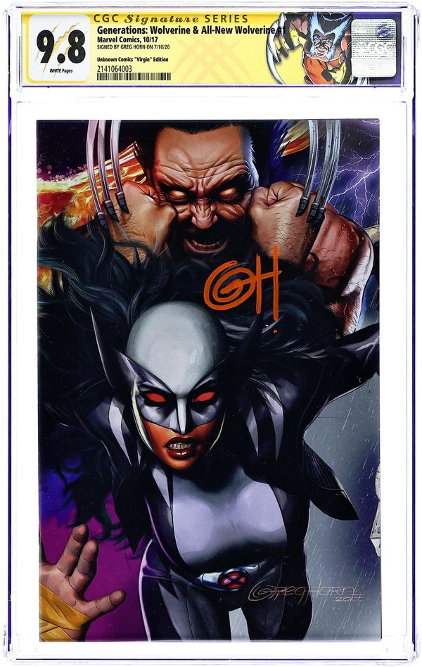 Ended Oct 17 2025 Bid History 9 bids Winning Bid $49 Unknown Comics exclusive Virgin Cover by Greg Horn. Written by Tom Taylor. Art by Ramon Rosanas. THE TEAM-UP YOU'VE ALL BEEN ASKING FOR! The death of WOLVERINE shook the Marvel Universe… And the ascension of the ALL-NEW WOLVERINE reimagined what a healing factor and some Adamantium claws can do! But the amazing combination of LOGAN and LAURA is the duo you've been waiting for! Tom Taylor, the mind behind ALL-NEW WOLVERINE, brings you Generations…a double-Wolverine team-up for the ages! 36 pages, full color. Rated T+ Cover price $4.99. Grade: CGC 9.8 explanation of grade Condition: Used (collectible)
