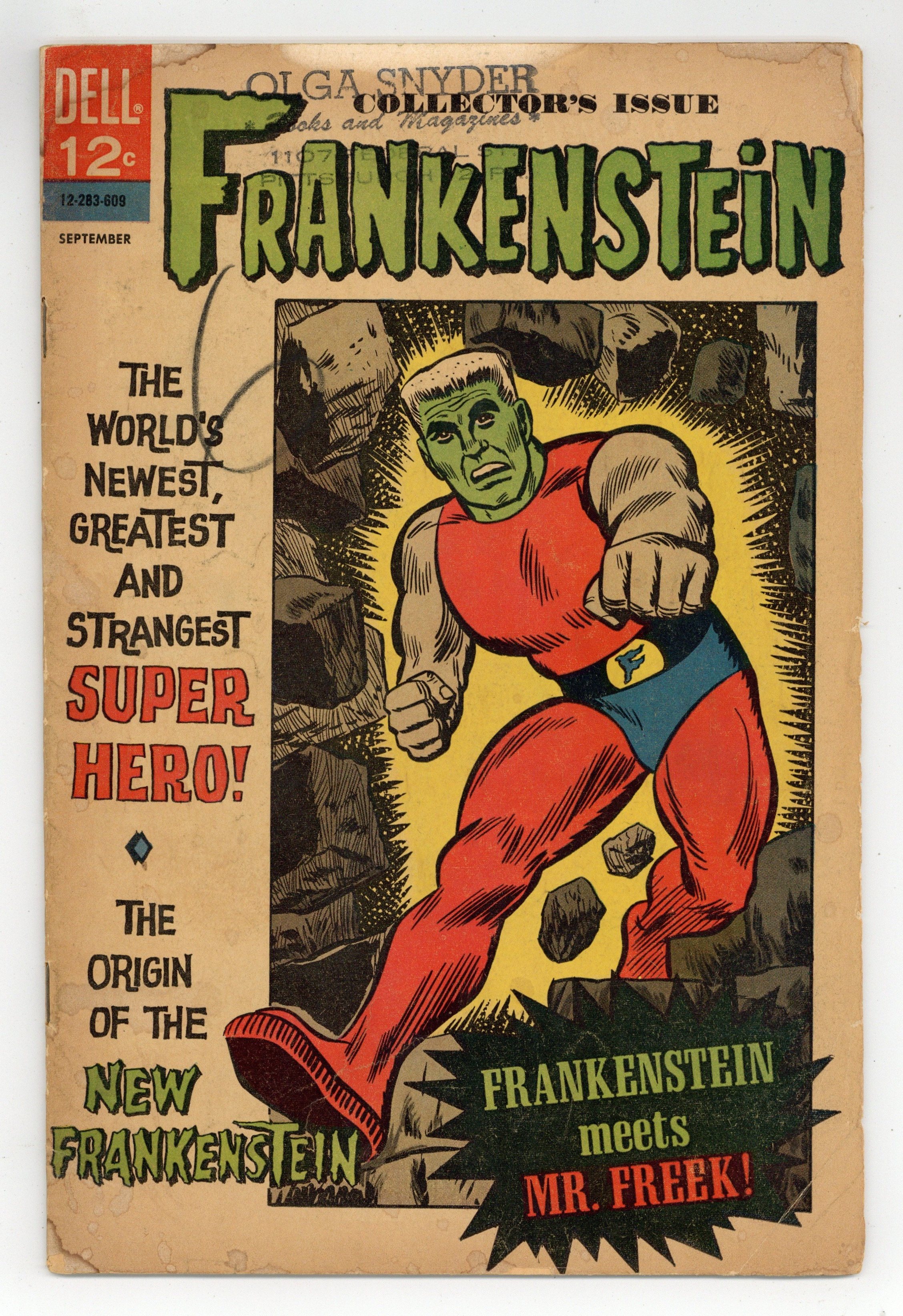 Ends Dec 8 8:24 PM CST Bid History 3 bids Current Bid $4 Your Secret Max Bid If you'd like to bid, please log in or register. Cover by Tony Tallarico. Story by D. J. Arneson. Art by Tony Tallarico and others. Coming somewhat late to the superhero party, Dell combines classic monsters and superheroes, hoping for a winning combination. Revived by a lightning bolt, the Monster of Frankenstein awakens in modern America. Given a fortune by a kindly billionaire, he takes the name Frank Stone, while fighting crime at night in a Frankenstein mask. Only his devoted butler William knows his secret, but journalist Miss Ann Thrope willingly steps into the role of Frankenstein's Lois Lane. Frankenstein; The Rebirth of Frankenstein; The Reward. 32 pages, Full Color. Cover price $0.12. Grade: GD 2.0 explanation of grade Condition: Used (collectible)