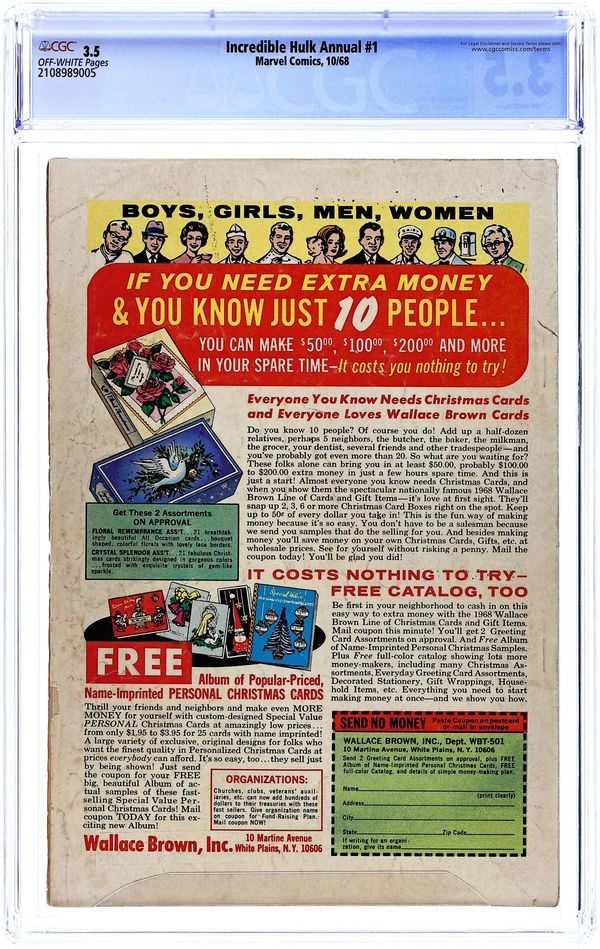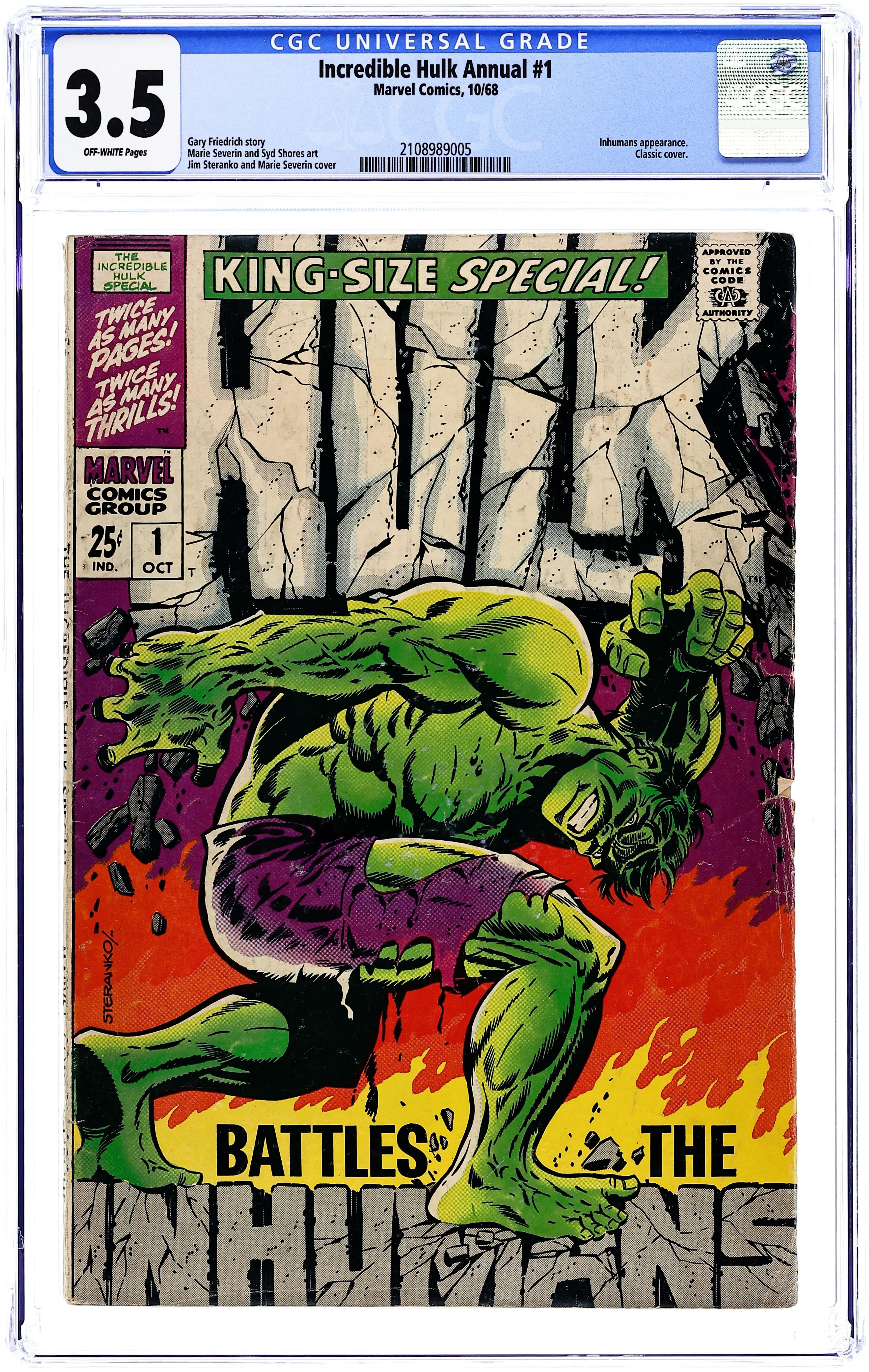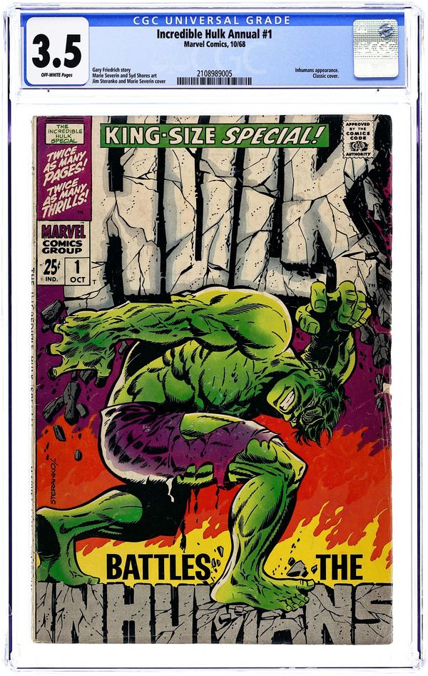 New story: the Hulk battles the Inhumans in "A Refuge Divided!" Script by Gary Friedrich, pencils by Marie Severin, inks by Syd Shores (and others). Jim Steranko cover (with the head redrawn by Severin). 68 pages, full color. Cover price $0.25. Grade: CGC 3.5 explanation of grade Condition: Used (collectible)