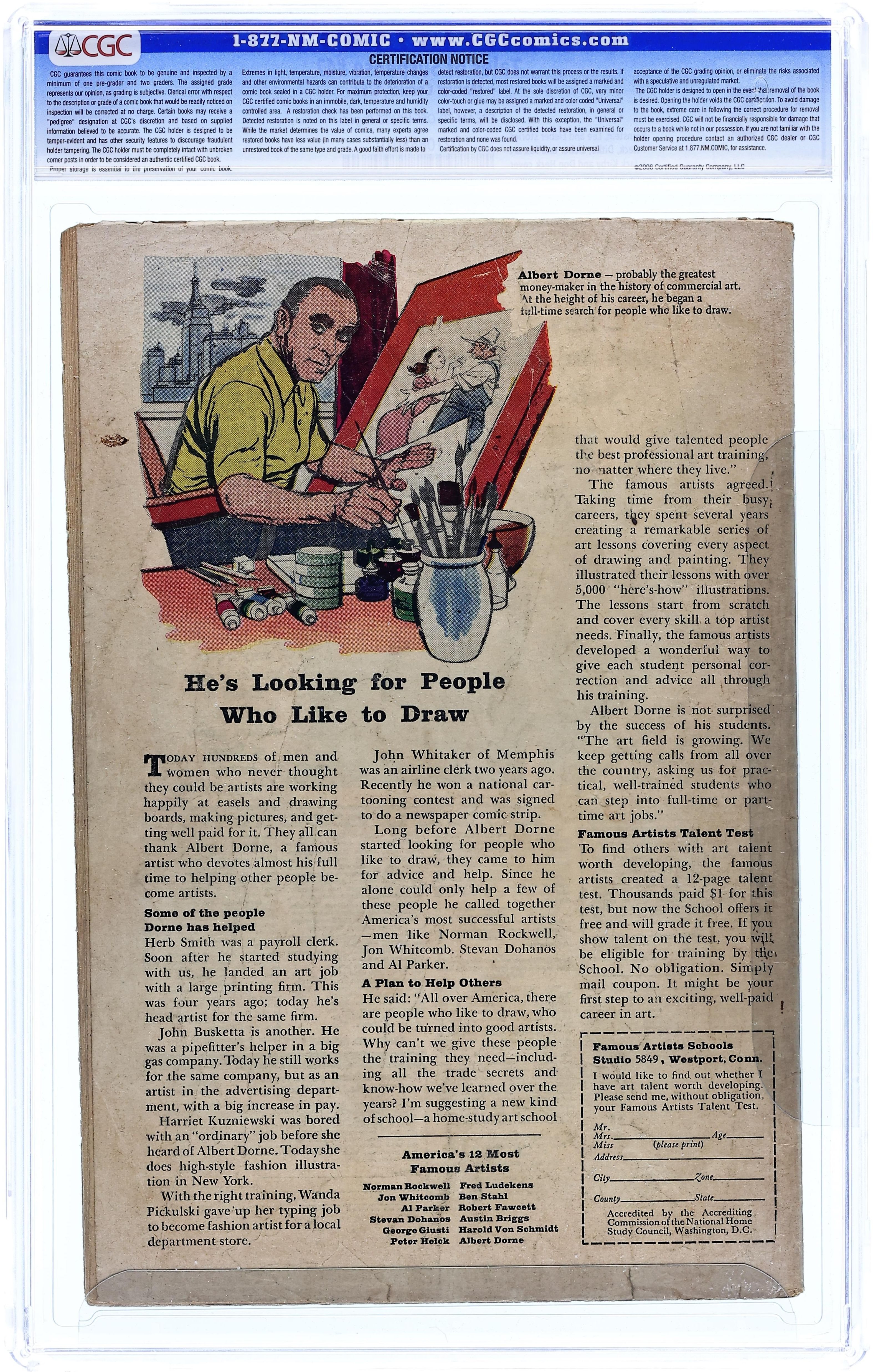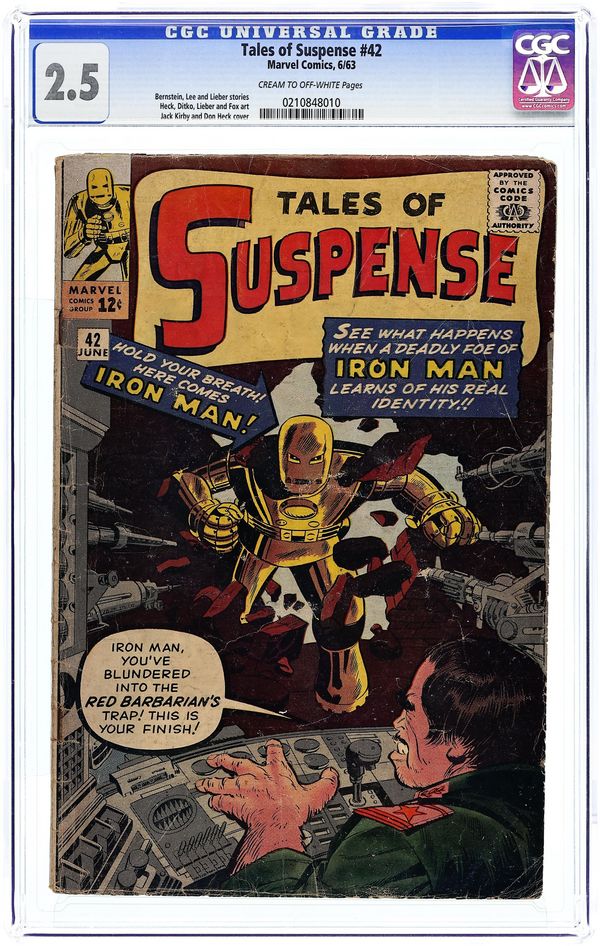 Cover pencils by Jack Kirby, inks by Don Heck. "Trapped by the Red Barbarian," script by Stan Lee (plot); Robert Bernstein (as R. Berns) (script), art by Don Heck; A Soviet spymaster sends a master of disguise to steal the design of Tony Stark's latest weapon; The Actor steals the plans and learns Iron Man's secret identity, but Iron Man regains the plans and tricks the communists into killing their own agent. "Discovery" text story, art by Joe Maneely. "I Speak of the Haunted House!", script by Stan Lee, art by Steve Ditko; Two friends make a bet about the existence of ghosts in a haunted house; The doubting friend thinks he saw no ghosts, but the house itself is a ghost. "Escape into Space," script by Stan Lee (plot) and Larry Lieber (script), pencils by Larry Lieber, inks by Matt Fox; A convict believes that he escaped his captors on a strange planet, but the plan all along was for him to serve his sentence there, thinking that he is free. 36 pages, full color. Cover price $0.12. Grade: CGC 2.5 explanation of grade Condition: Used (collectible)