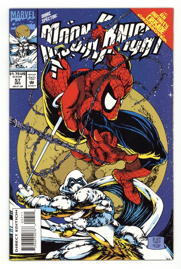 Cover art by Stephen Platt. Black Sheep, script by Terry Kavanagh, pencils by Stephen Platt, inks by Chris Ivy, Al Vey, and Scott Koblish; The Goddess sends Moon Knight to stop the intruding Spider-Man from interfering with her plans. Infinity Crusade crossover. History of the Bloodline Moon Knight article, art by Bill Sienkiewicz. 36 pgs. $1.75. Cover price $1.75. Grade: VF/NM 9.0 explanation of grade Condition: Used (collectible)