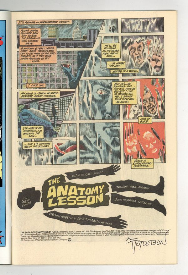 Direct Edition. Cover art by Tom Yeates. The Anatomy Lesson, script by Alan Moore, art by Stephen R. Bissette and John Totleben; General Sunderland hires Jason Woodrue to examine Swamp Thing and determine how Alec Holland became the monster, but Woodrue discovers that Swamp Thing only thinks that he was Alec Holland; When Sunderland fires Woodrue, the scientist allows Swamp Thing to take revenge on Sunderland for the both of them; new origin for Swamp Thing. 36 pgs., full color. $0.75. Cover price $0.75. Grade: VF- 7.5 explanation of grade Condition: Used (collectible)