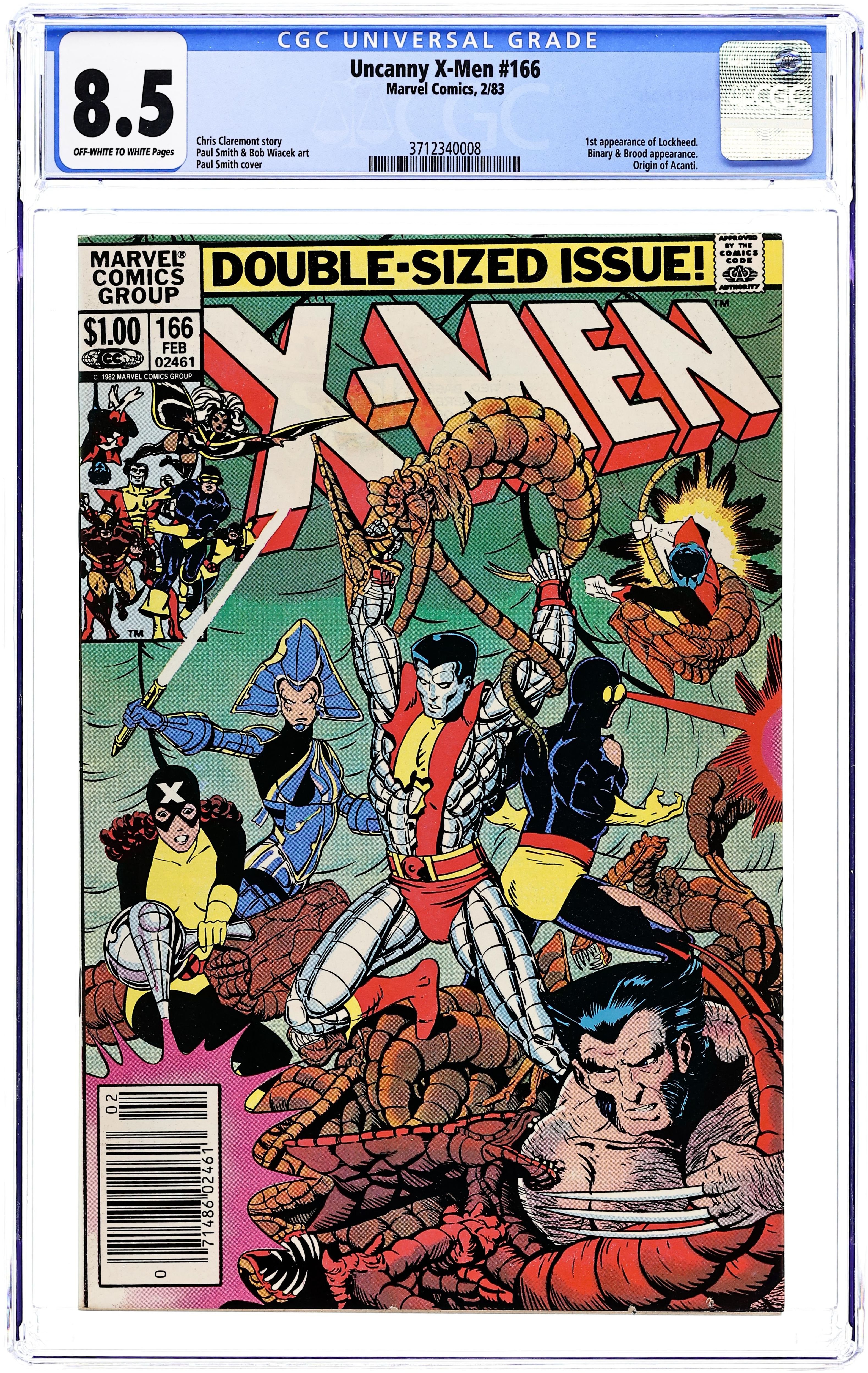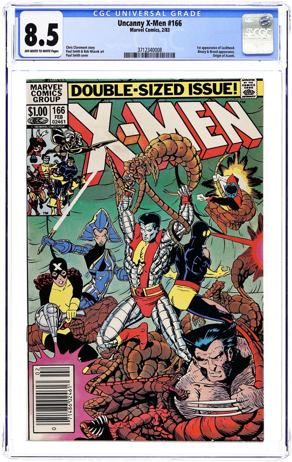 Ended Oct 27 2025 Bid History 5 bids Winning Bid $25 Newsstand Edition. Part 5 of 6. Story by Chris Claremont. Art by Paul Smith and Bob Wiacek. It's the final battle between the sinister Brood and the Uncanny X-Men. But when the Earth heroes learn a startling secret about their mentor, Professor X, they discover that they may already be too late to save their home world. First appearance of Lockheed. 52 pgs. Cover price $1.00. Grade: CGC 8.5 explanation of grade Condition: Used (collectible)