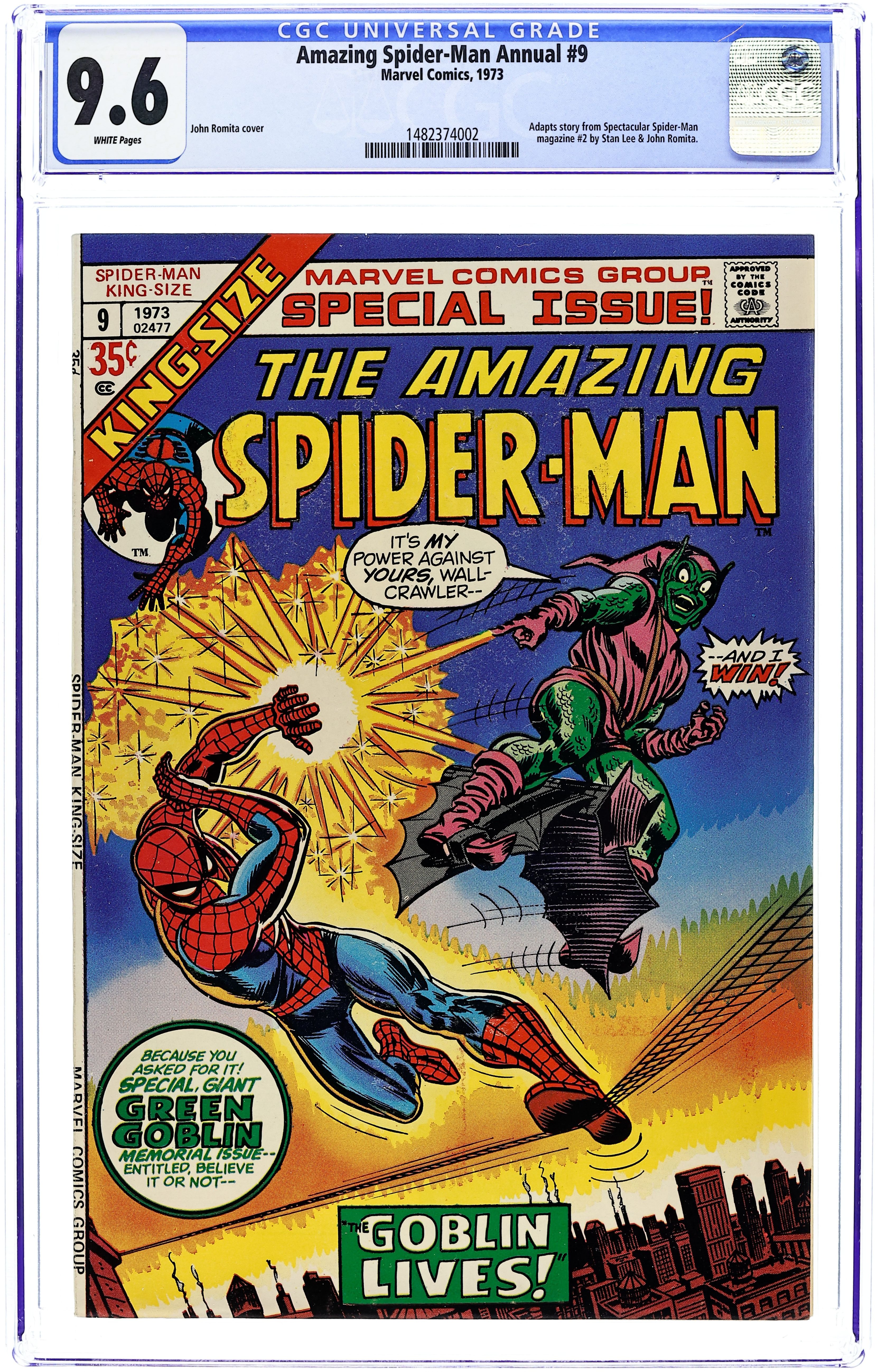 This annual reprints Spectacular Spider-Man (1968 Magazine) #2 in condensed format. "The Goblin Lives!" Script by Stan Lee. Art by John Romita (layouts, pencils), Jim Mooney (pencils, inks) and Frank Giacoia (inks). Redrawn cover by John Romita (from his original painted magazine cover). Norman Osborn relapses and recalls that he is the Green Goblin! Oh no! That is very bad news for the Amazing Spider-Man! The sinister goblin wastes no time in threatening Peter's dear Aunt May! And that quickly drawsthe web-slinger into a terrific no-holds-barred battle with his long-time foe! But this time the wall-crawler turns one of the goblin's tricks against him! Could a psychedelic pumpkin bomb be the key to victory? Cameo appearances by Aunt May, Gwen Stacy, George Stacy, Mary Jane Watson, Harry Osborn, and J. Jonah Jameson. (Notes: 18 pages from the original story are omitted in order to reduce the story to 40 pages to fit the annual format. Missing pages includes numbers 4, 5, 8-11, 17, 21, 23, 24, 27-29, 33, and 36. Elements of the plot briefly cross over with Amazing Spider-Man 66. The Green Goblin previously appeared (chronologically) in Amazing Spider-Man 39-40; and appears next in Amazing Spider-Man 96-98 (the memorable anti-drug issues). 52 pages. 35 cents. Cover price $0.35. Grade: CGC 9.6 explanation of grade Condition: Used (collectible)