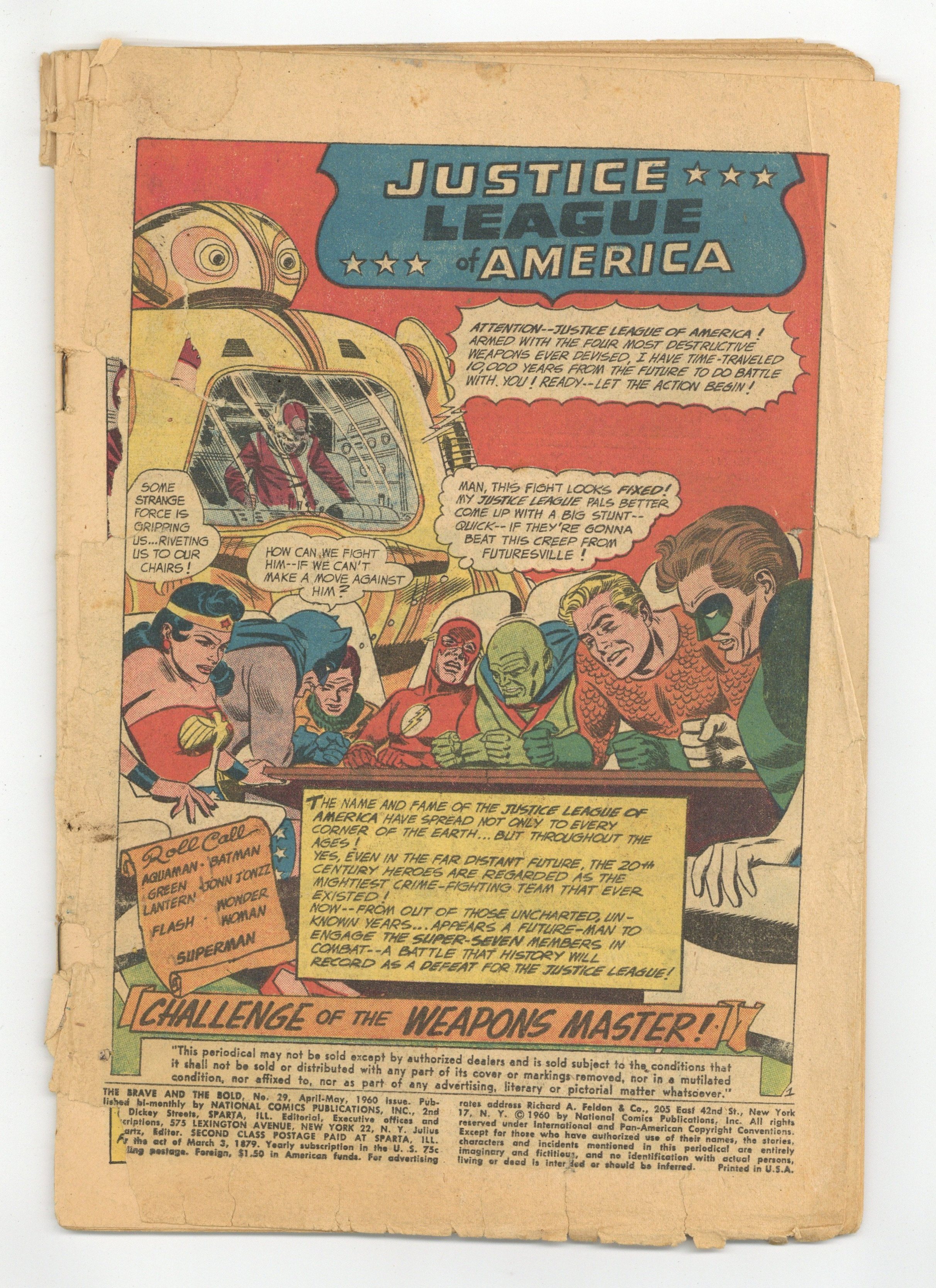 Ended Nov 10 7:43 PM CST Bid History 6 bids Winning Bid $24 Cover by pencils Mike Sekowsky, inks by Murphy Anderson. 2nd appearance of the Justice League of America in "Challenge of the Weapons Master!" Script by Gardner Fox, pencils by Mike Sekowsky, inks by Bernard Sachs and Joe Giella; Having found an ancient book that appears to indicate that he once defeated the JLA, Xotar travels from 11,960 to the present to test four weapons against the Justice League, in order to determine which weapon will help him defeat the Intersolar Police of his own day; But the JLA counters each of Xotar's weapons and returns him to face justice in his own time. 36 Pages, Full Color. Cover price $0.10. Grade: Coverless explanation of grade Condition: Used (collectible)