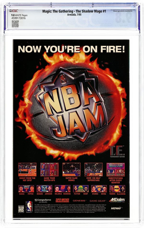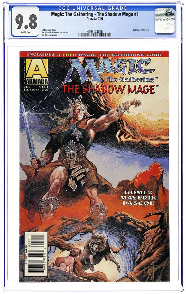 NOTE: We sell polybagged, and unbagged copies of this book as the same item and may not include the promo card. "The Aster Fall" - This is the first in a series of limited series relating just one of the epic sagas set on Dominia, the world of Magic: The Gathering! SHADOW MAGE tells the story of young Jared, a boy who is rescued from a spectacular battle and then cared for by a lowly Spellsquire. The old man spends years preparing Jared to take vengeance on the immensely powerful Planewalker who slew his father. This is the first in a series of adventures featuring Jared! Written by Jeff Gomez, with art by Val Mayerik and James Pascoe. Painted cover by Val Mayerik. Cover price $2.50. Grade: CGC 9.8 explanation of grade Condition: Used (collectible)