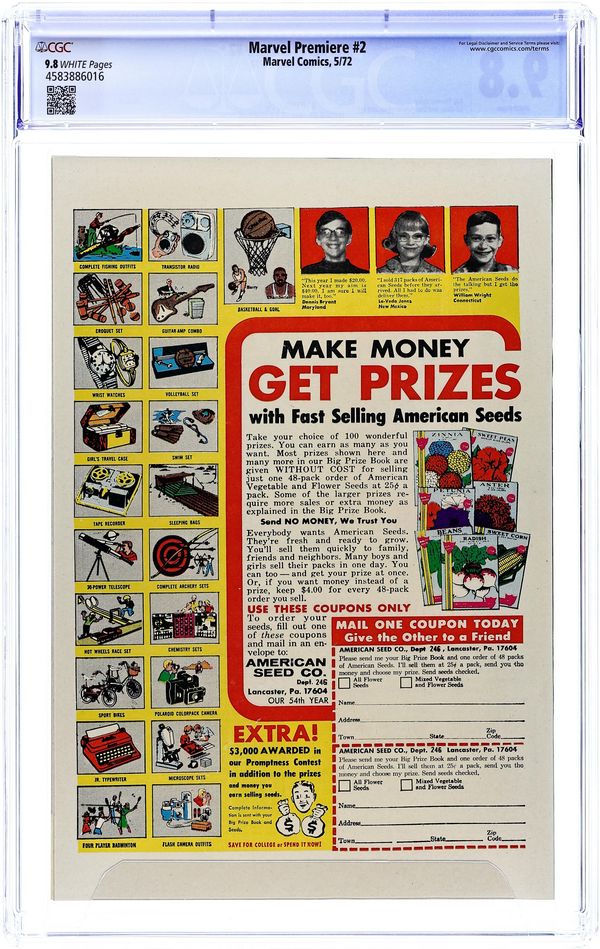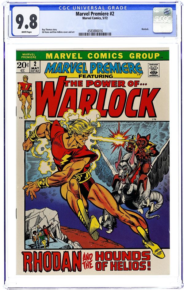 Cover pencils by Gil Kane, inks by Joe Sinnott. "The Hounds of Helios," script by Roy Thomas, pencils by Gil Kane, inks by Dan Adkins; Warlock lands on the High Evolutionary's Counter-Earth with his memory lost but recalls being called Warlock, so Ellie Roberts gives him a first name, Adam. Untitled Yellow Claw story, script and pencils by Jack Kirby, inks by Jack Kirby and Roz Kirby; 4 page reprint starring S.H.I.E.L.D. agent Jimmy Woo, Suwan and the dread Yellow Claw; Reprinted from Yellow Claw #2. 36 pgs., full color. Cover price $0.20. Grade: CGC 9.8 explanation of grade Condition: Used (collectible)