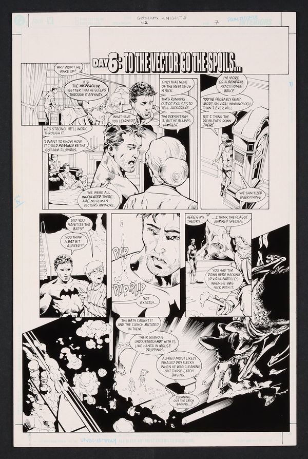 Leslie and Bruce descend into the Batcave to discuss how The Clench, the virus that ravaged Gotham during the Contagion storyline, could have returned- turns out it's due to the cave's less heroic inhabitants! Pencil and ink on DC Comics art board. 11 1/4" X 17".