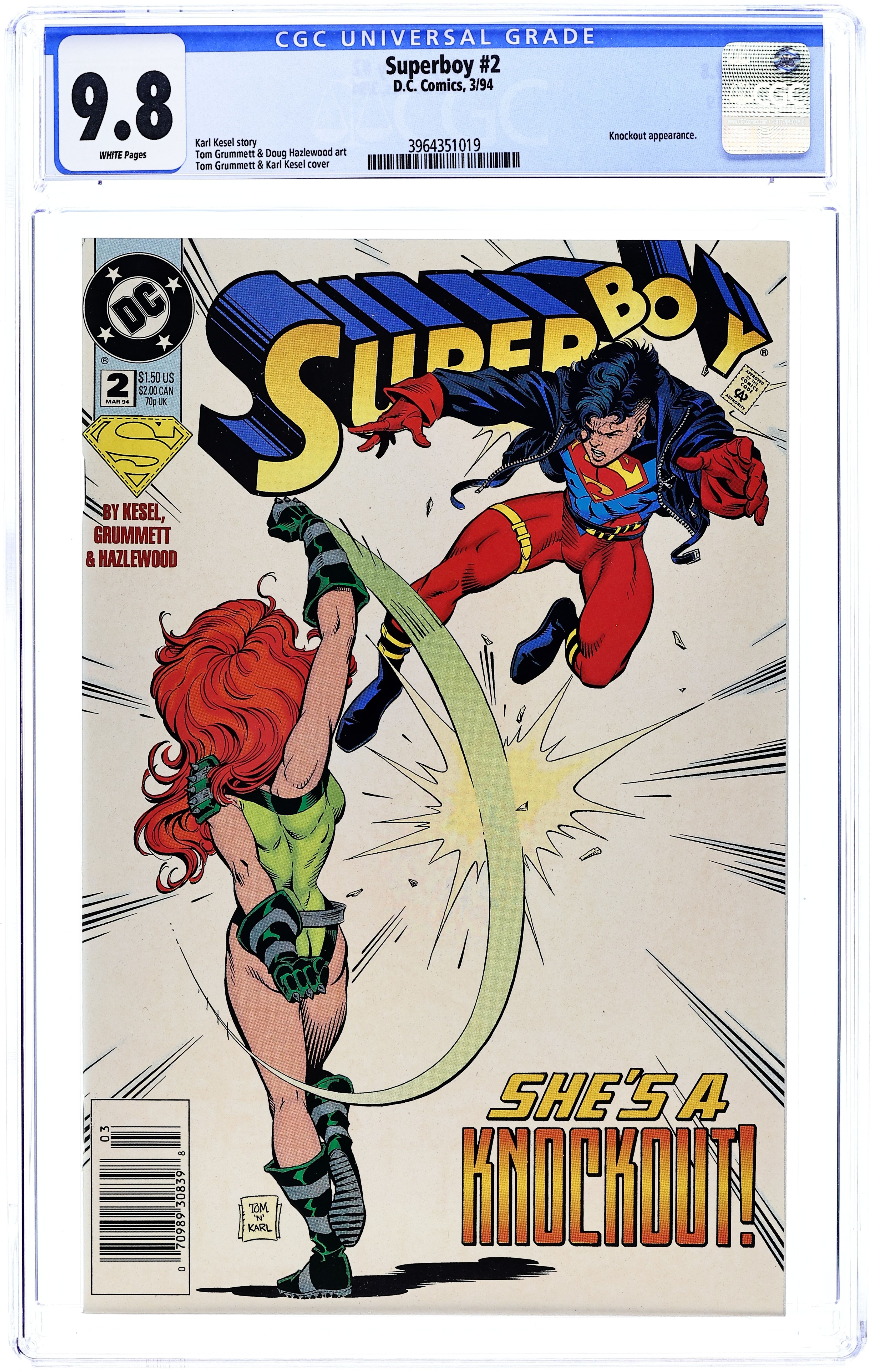 Ended Aug 25 2025 Winning Bid $27 "Knockout!" Story by Karl Kesel. Art by Tom Grummett and Doug Hazlewood. When the red bombshell known as Knockout sets her sights on Superboy, she'll give the Teen of Steel a night he won't soon forget. Plus, a mysterious foe obtains a new powerful weapon and leaves Superboy pondering his identity. Cover price $1.50. Grade: CGC 9.8 explanation of grade Condition: Used (collectible)