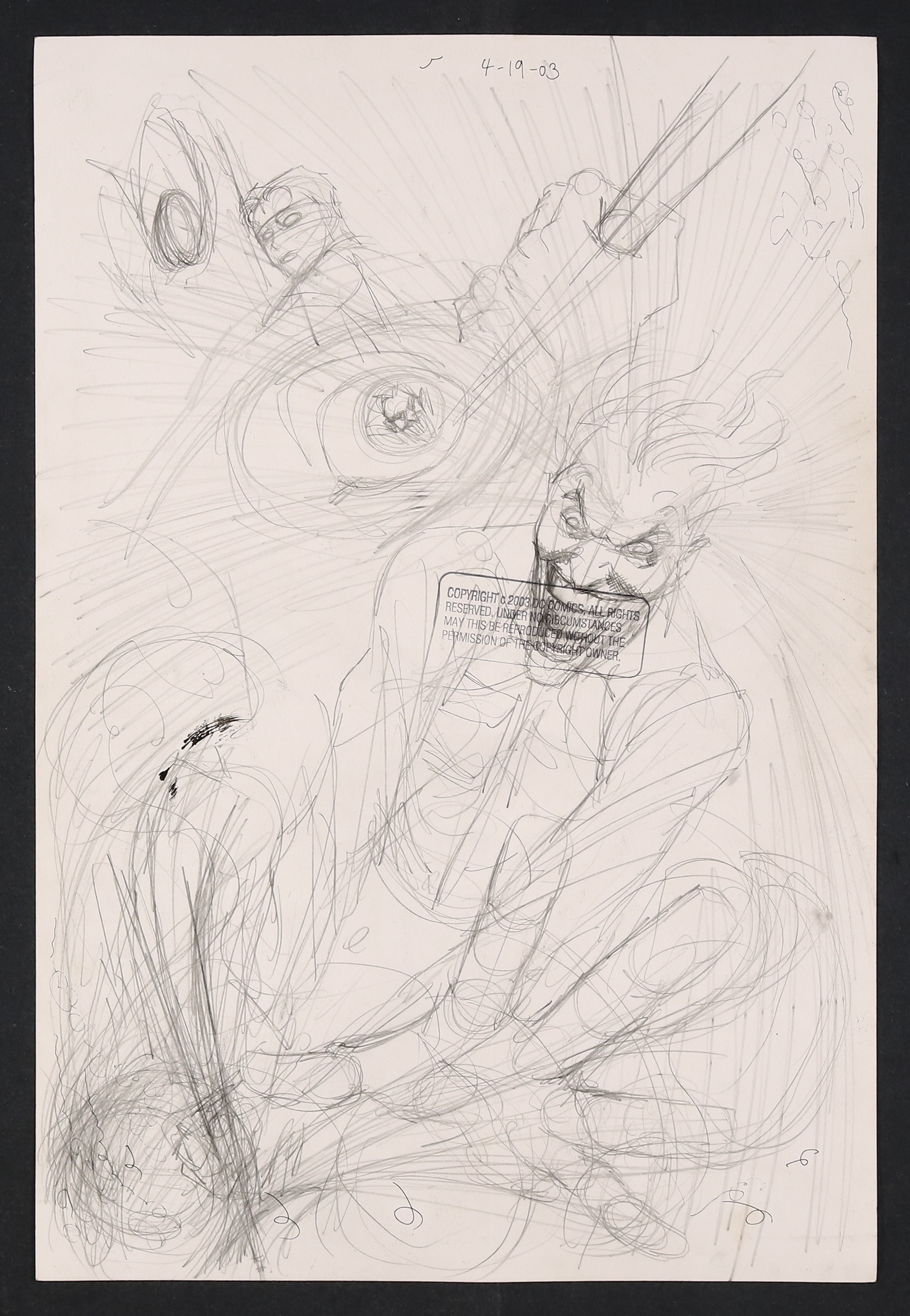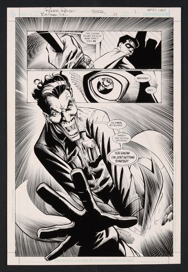 What an opening splash! What better way to open an issue about the fallout of the death of Jason Todd than with...the death of Jason Todd! Shocking and kinetic, Robinson and Floyd absolutely nail the manic violence of the Joker here with some great touches including the slightest panel-break in the lower margin and a just-enough amount of blood! Pencil and ink of DC Comics art board. 11 1/4" X 17".