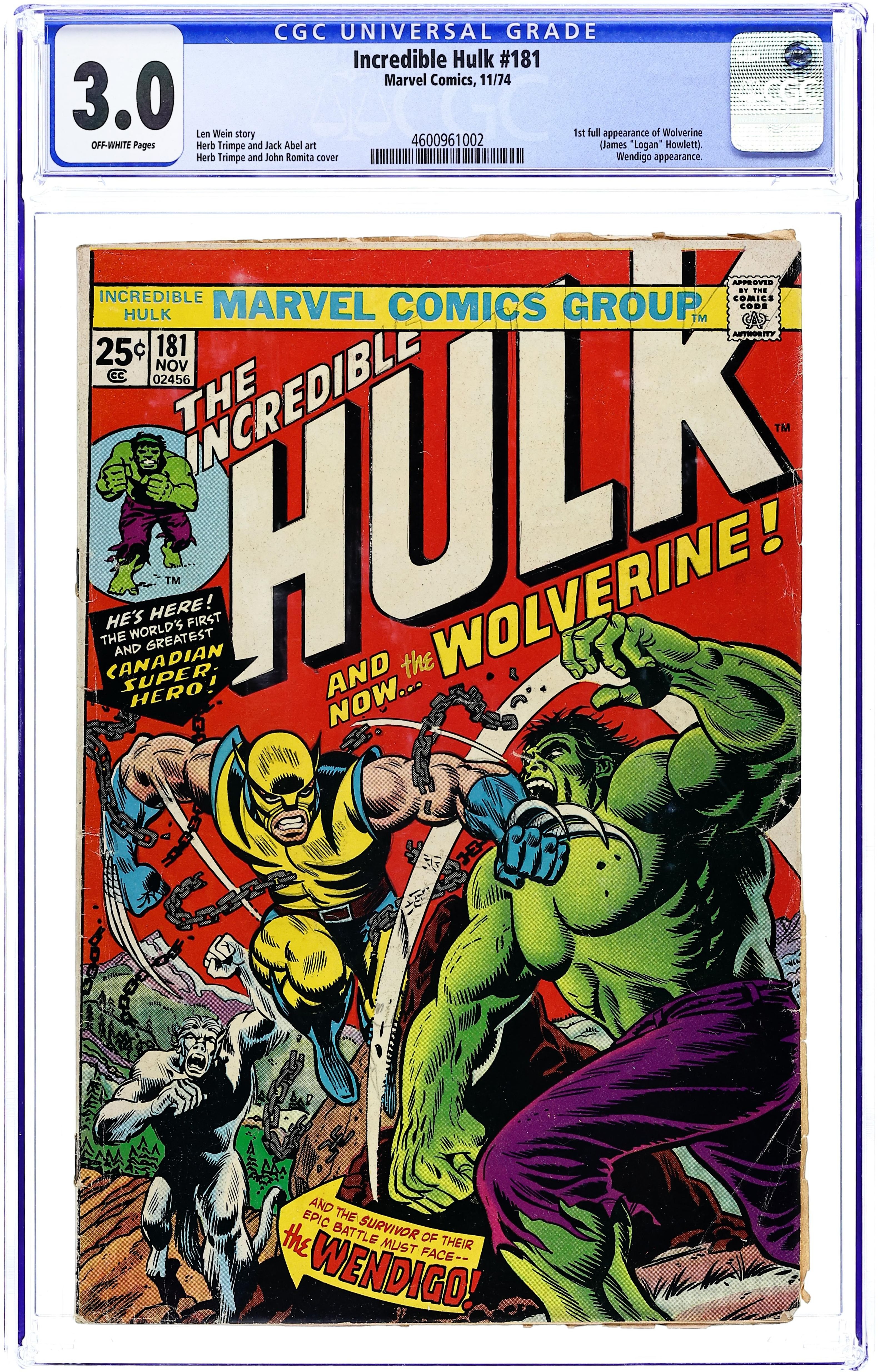 First full Wolverine story (cameo appearance in previous issue). Cover art by Herb Trimpe. And Now...The Wolverine!, script by Len Wein, pencils by Herb Trimpe, inks by Jack Abel; Canadian super-agent Wolverine teams up with the Hulk to battle Wendigo; Once the monster is felled, however, Wolvie turns on the Hulk and the two battle; Marie goes ahead with her plans of trying to transfer the power of the Wendigo into the Hulk but when the guilt becomes too much for best friend Georges who feels responsible for Paul's monstrous condition, he works the change on himself; Paul Cartier is returned to human form and Georges becomes the Wendigo. Wendigos story continues in Monsters Unleashed 9.Marvel Value Stamp #54 (Shanna). Letter from Mary Jo Duffy. 36 pgs. $0.25. Cover price $0.25. Grade: CGC 3.0 explanation of grade Condition: Used (collectible)