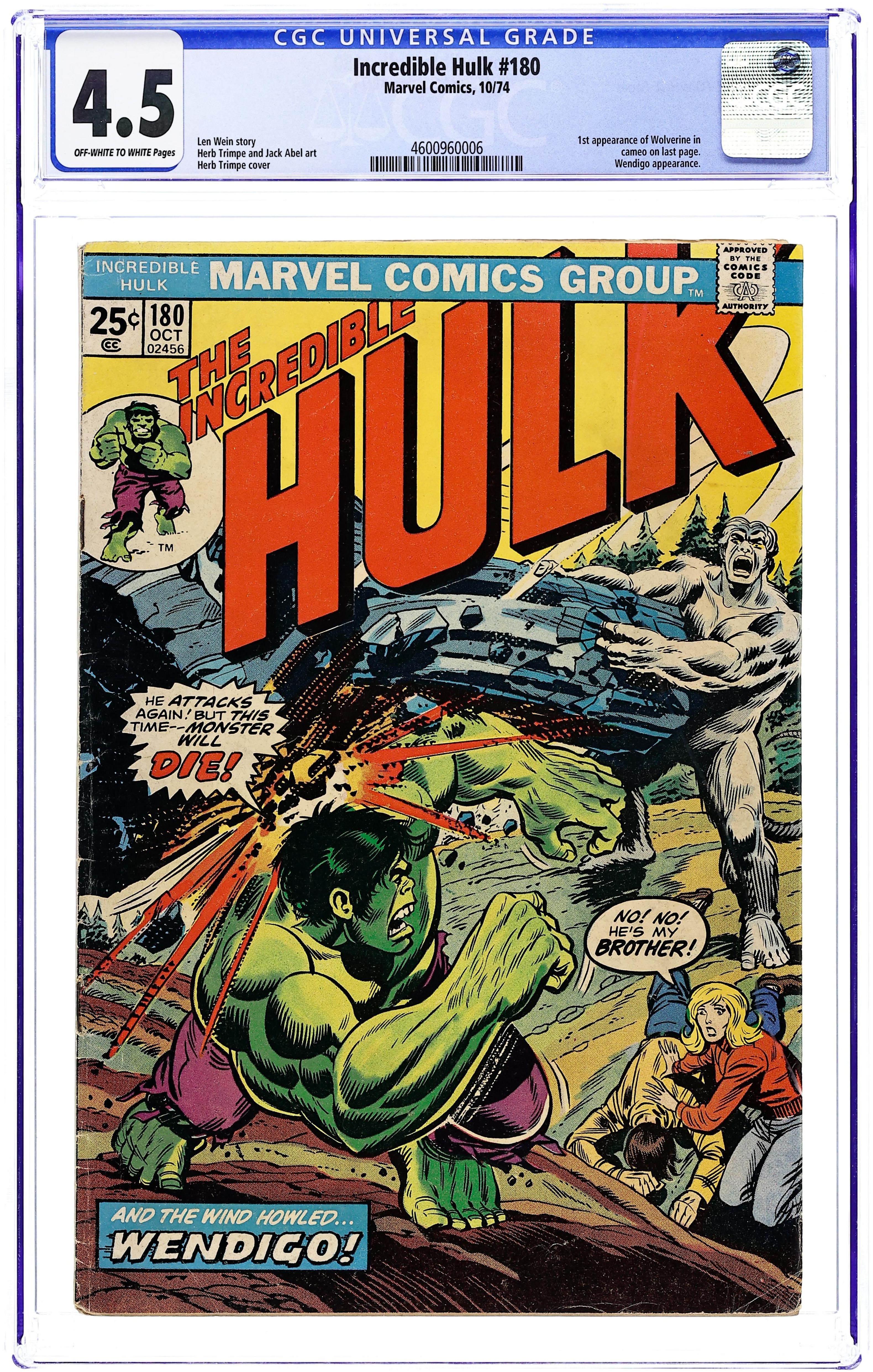 First appearance of Wolverine (cameo last panel). Cover art by Herb Trimpe. And the Wind Howls...Wendigo!, script by Len Wein, pencils by Herb Trimpe, inks by Jack Abel; Hulk is in Canada looking for some peace and quiet when he is mysteriously drawn to a cave inhabited by the sister of the man who became the Wendigo; Marie and Georges plan on transferring the power of the Wendigo to the Hulk, thus restorin Paul Cartier to his normal life; Marie's magic isn't strong enough, however, and just as Wendigo shows up, the Hulk wakes up from his magical slumber and the two battle; The Canadian government gets involved and sends in their own agent to take care of a recent Hulk sighting, the mutant known as Wolverine. Marvel Value Stamp Series A (Cyclops). 36 pgs. $0.25. Cover price $0.25. Grade: CGC 4.5 explanation of grade Condition: Used (collectible)
