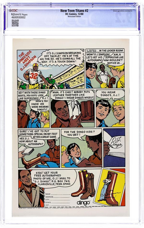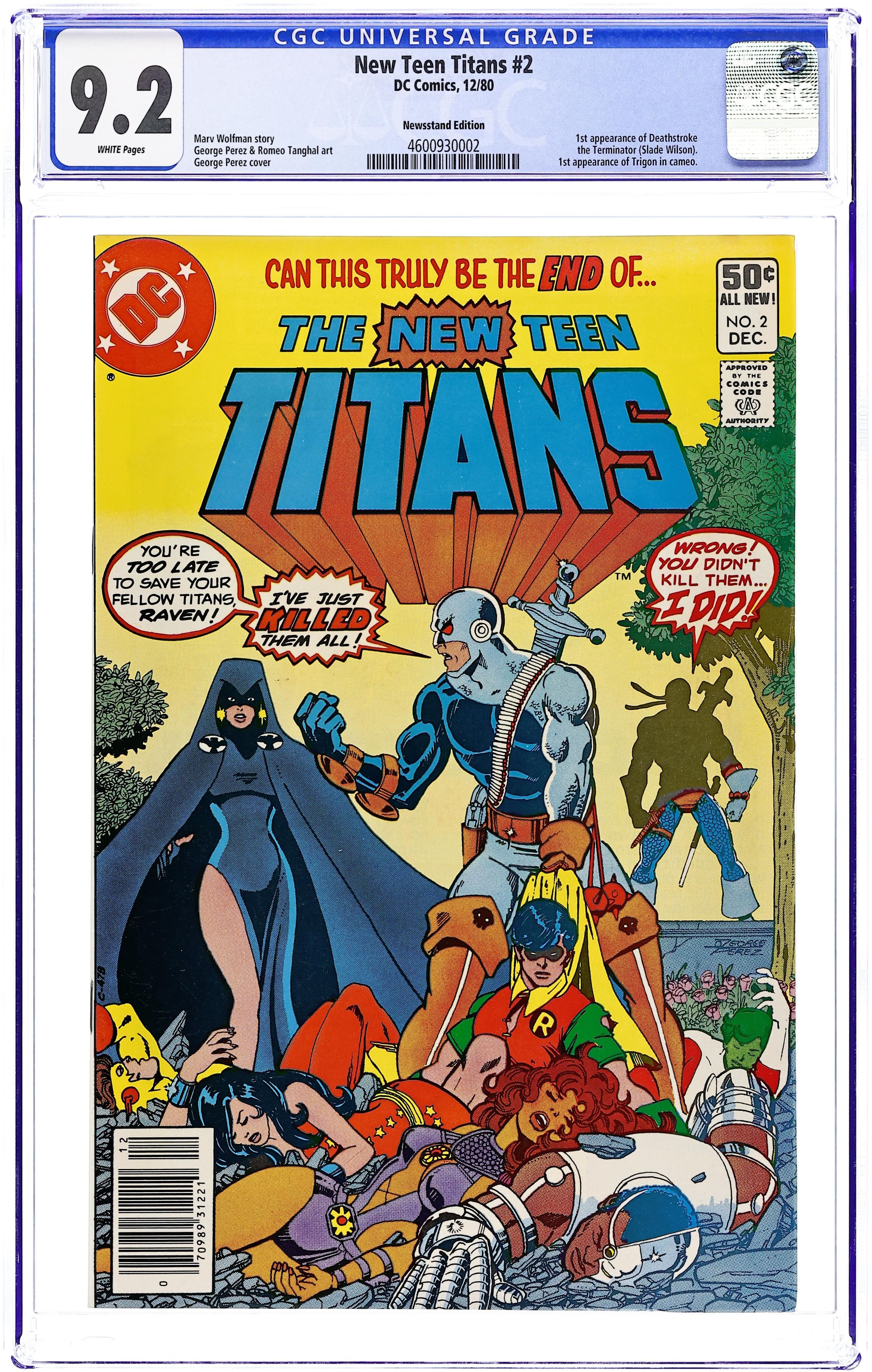 Newsstand Edition. First appearance of Deathstroke the Terminator in "Today...the Terminator!" Characters: Teen Titans [Robin; Kid Flash; Wonder Girl; Cyborg; Starfire; Raven; Changeling]; The Terminator [Slade Wilson] (1st; Later Deathstroke); The Ravager [Grant Wilson] (Intro; Death); Wintergreen (Intro); HIVE. Script by Marv Wolfman, with art by George Perez and Romeo Tanghal. Plus: an article by Marv Wolfman on the revival of the Teen Titans. Cover by George Perez. Cover price $0.50. Grade: CGC 9.2 explanation of grade Condition: Used (collectible)