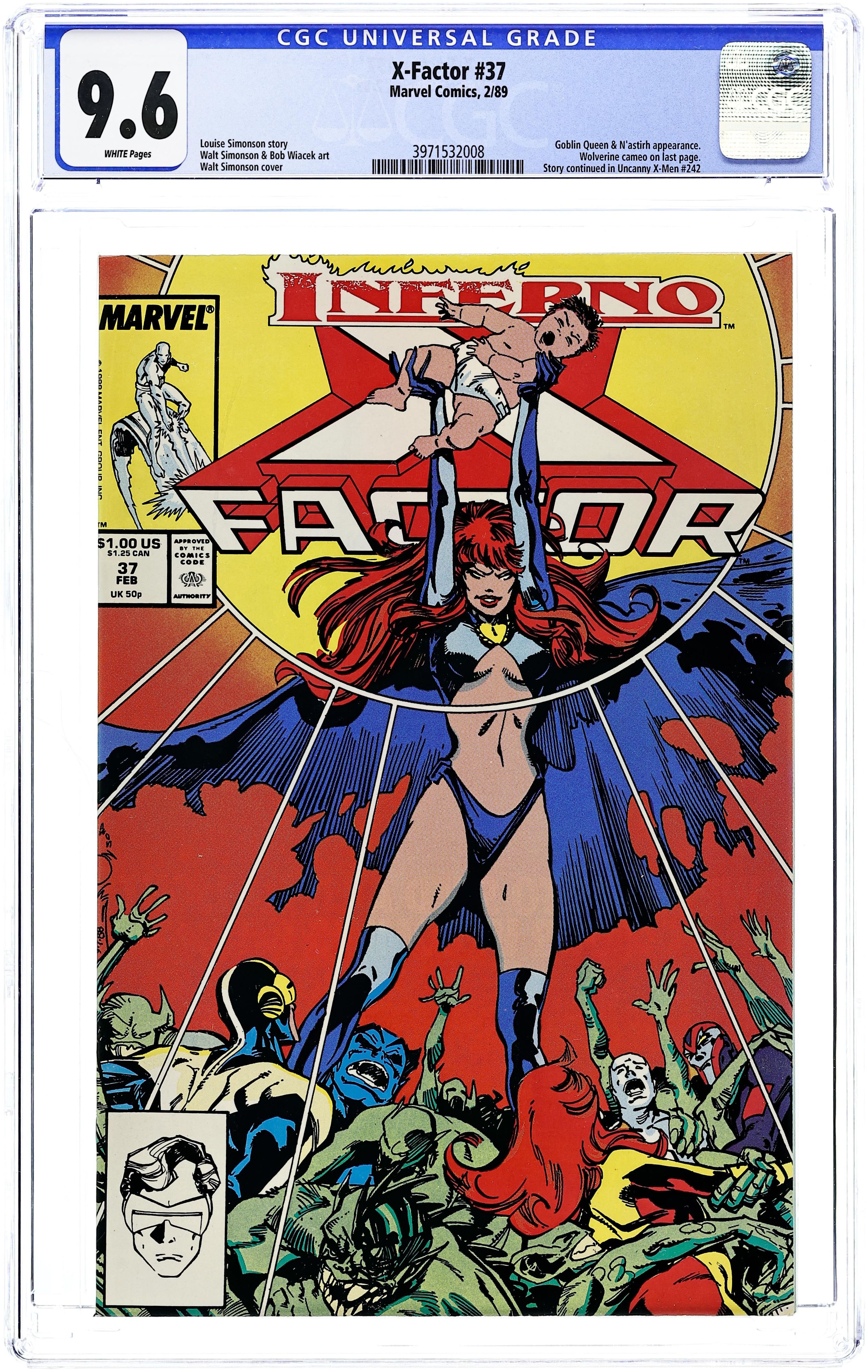 Inferno! "A Matter of Honor!" Story by Louise Simonson. Art by Walter Simonson and Bob Wiacek. Thanks to the efforts of New York's super-hero community the Demon Effect is now fading (see Uncanny X-Men (1963) #241, New Mutants (1983-1991 1st Series) #71, X-Terminators (1988) #1-4, Amazing Spider-Man (1963-1998 1st Series) #311-313, and Web of Spider-Man (1985) #47-48). This allows X-Factor to take the fight to the Goblin Queen herself. Story continues in Uncanny X-Men #242. Cover price $1.00. Grade: CGC 9.6 explanation of grade Condition: Used (collectible)