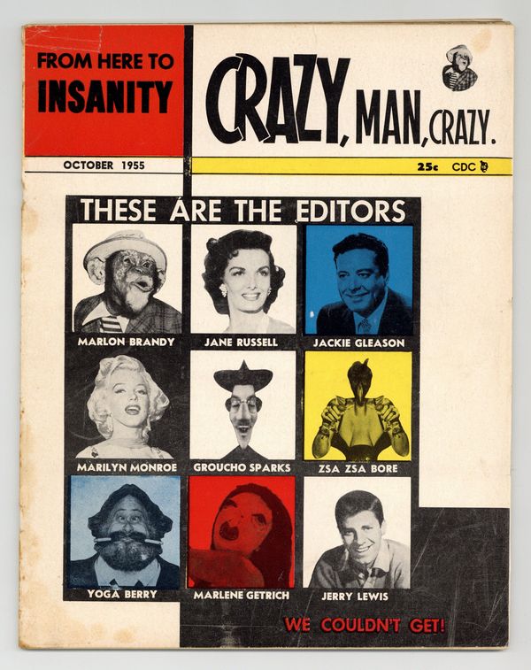 Ends Dec 8 8:25 PM CST Bid History 2 bids Current Bid $2 Your Secret Max Bid If you'd like to bid, please log in or register. Stories and art by Dick Ayers, Art Gates, Carl Hubbell and Fred Ottenheimer. Charlton's Mad imitator continues its hit-or-miss parodies of 1950s pop culture, converting to a magazine format with this issue, as Mad did. This issue features no art by Marvel legend Jack Kirby, contrary to some sources (the Kirby art is in issue #11). Photo cover includes 1950s icons Marilyn Monroe, Jane Russell, Jackie Gleason, and Jerry Lewis. How Davy Crockett rose up from a simple frontiersman to a 1950s TV star. Parodies of the films Blackboard Jungle and Marilyn Monroe's The Seven Year Itch. Another 1950s icon, trans pioneer Christine Jorgensen, gets the From Here to Insanity treatment. An indecipherable article written in "jazz" lingo. Spoofs of 1950s advertising, including shampoo, deodorant, and cigarettes ads. Haloo Shampoo; Chase & Sunburn Coffee; Old Spicy Sticky Deodorant; Classified Ads; The Raving Reporter; How Davy Crockhead Captured America; The Man on the Flying Trapeze; Confidentially; The Truth About the French Pose Card Raquet; The Truth About Army Justice; Why Gretel Garbow Wants Her Privacy; Operation Denmark; The Truth About the Einstein Experts; I Toyed With the Hearts of Men; Blackboard Jumble; Fisherman's Daily Guide for August; How to Catch a Man; Camp Minnacootchie; Eat Younger and Look Older; Jive Me Gently; You Too Can Dance; How To Pour a Patio; Across and Drowkcab Puzzle; Insanity Removes the Wraps from Atomic Age's Most Explosive Pin-Ups!; Recommended by Huncan Dines; Those T.V. Commercials; Maryland Monrowboat in "The Seven Year Twitch"; French Girdle; Pearliaments Cigarettes. Final issue under this title; series continues as Crazy, Man, Crazy (1955) #1. 8.5-in. x 11-in., 64 pages, B&W. Cover price $0.10. Grade: GD+ 2.5 explanation of grade Condition: Used (collectible)