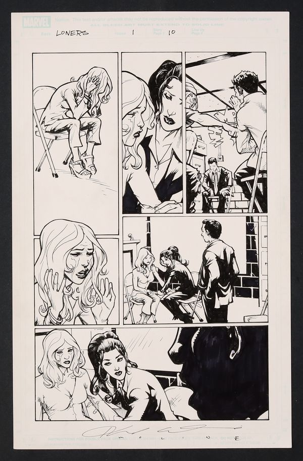 An interesting series penned by the future EiC of Marvel Comics CB Cebulski, Loners followed a support group made up of former heroes trying to put their powers behind them. Here we see Julie Power of Power Pack breaking down in front of the group as they debate how much the nature of their powers defines who they are as people, emotions captured perfectly by Moline. Signed by Moline in the lower margin. Pencil and ink on Marvel Comics art board. 11" x 17 1/4".
