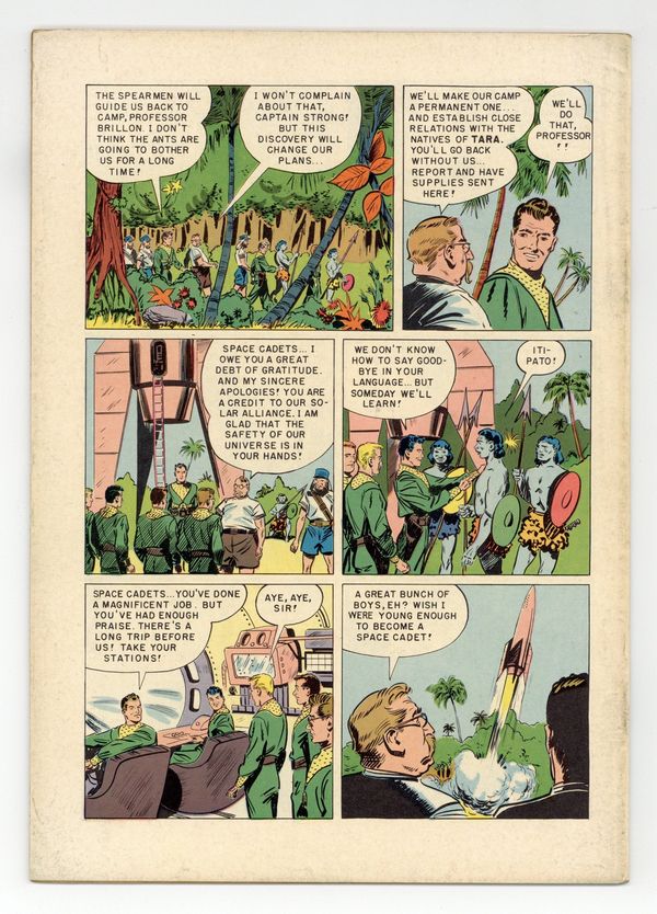 Ended Oct 27 2025 Bid History 20 bids Winning Bid $96 Painted cover by Al McWilliams. Stories by Paul S. Newman and others. Art by Jack Lehti and others. Adventures in space, based on the pioneering sci-fi TV show Tom Corbett, Space Cadet. Tom and the rest of the cadets accompany a scientific expedition to the planet Tara. There, they find blue aliens, giant ants, and danger. Plus a photo still from the TV series. Painted cover by Al McWilliams. 32 pages, Full Color. Cover price $0.10. Grade: FN- 5.5 explanation of grade Condition: Used (collectible)