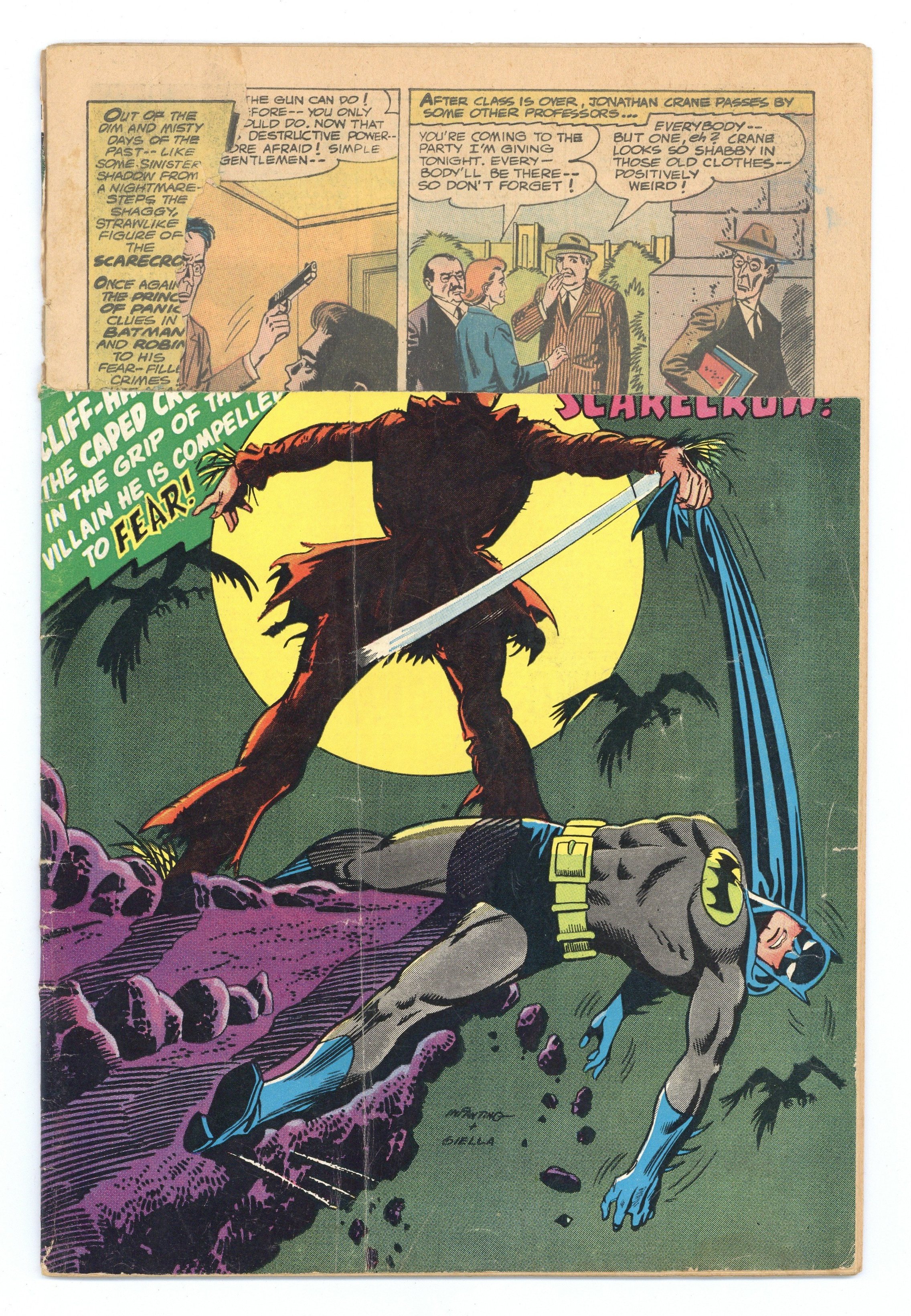 Cover pencils by Carmine Infantino, inks by Joe Giella. 1st Silver Age appearance of Scarecrow in book-length story, "Fright of the Scarecrow!", script by Gardner Fox, pencils by Sheldon Moldoff (as Bob Kane), inks by Joe Giella; While entertaining some children in the park, Dick happens to notice the Scarecrow retrieving buried loot from a past robbery; He calls in Batman and together they battle their old foe until they are blinded by Scarecrow's fear gas. Little Pete humor half-page by Henry Boltinoff. Letter from comic book writer Mark Evanier. Peace on Earth public service announcement. Eyes Front! humor half-page by Henry Boltinoff. 36 Pages, Full Color. Cover price $0.12. Grade: PR 0.5 explanation of grade Condition: Used (collectible)