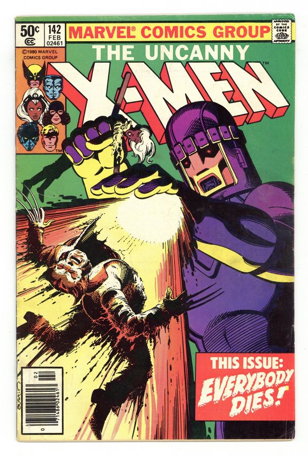 Newsstand Edition. Days of Future Past: Part 2 of 2. "Mind Out of Time!" Story by Chris Claremont and John Byrne. Art by John Byrne and Terry Austin. Cover by Terry Austin. In order to prevent a dystopian future where all mutants and super-heroes are hunted and killed by the robotic Sentinels, the X-Men must prevent the new Brotherhood of Evil Mutants from assassinating Senator Kelly. Featuring one of the most shocking death scenes in the comic book history. NOTE: Uncanny X-Men #123 and #142 are rare commodities in the realm of comics as they are two of the very few covers where inker extraordinaire Terry Austin actually does the pencils as well. - Odinson Lone Star Comics Archivist.36 pgs. Cover price $0.50. Grade: VG 4.0 explanation of grade Condition: Used (collectible)