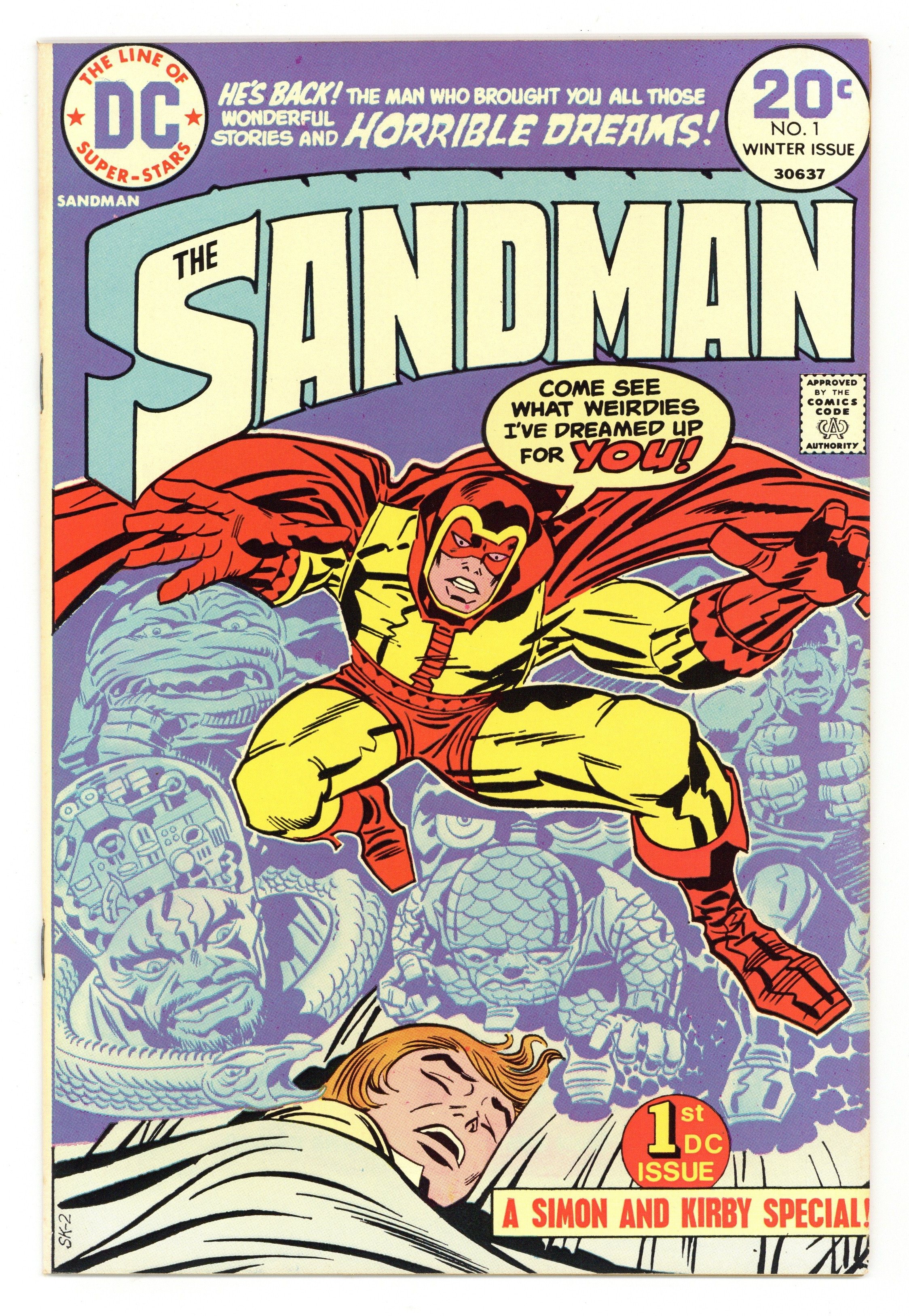 Purple cover variant. 1st Bronze Age Sandman. Last Simon & Kirby collaboration. Cover by Jack Kirby and Frank Giacoia. General Electric, script by Joe Simon, art by Jack Kirby and Mike Royer; When a boy named Jed Walker has a strange dream of a drowning man who appears in reality to give him an evil little doll, it spurs the Sandman to emerge from the Dream Stream into the real world to stop the plans of General Electric. Article on memory and dreams by Alan Asherman. 36 pgs., full color. $0.20. Cover price $0.20. Grade: FN- 5.5 explanation of grade Condition: Used (collectible)