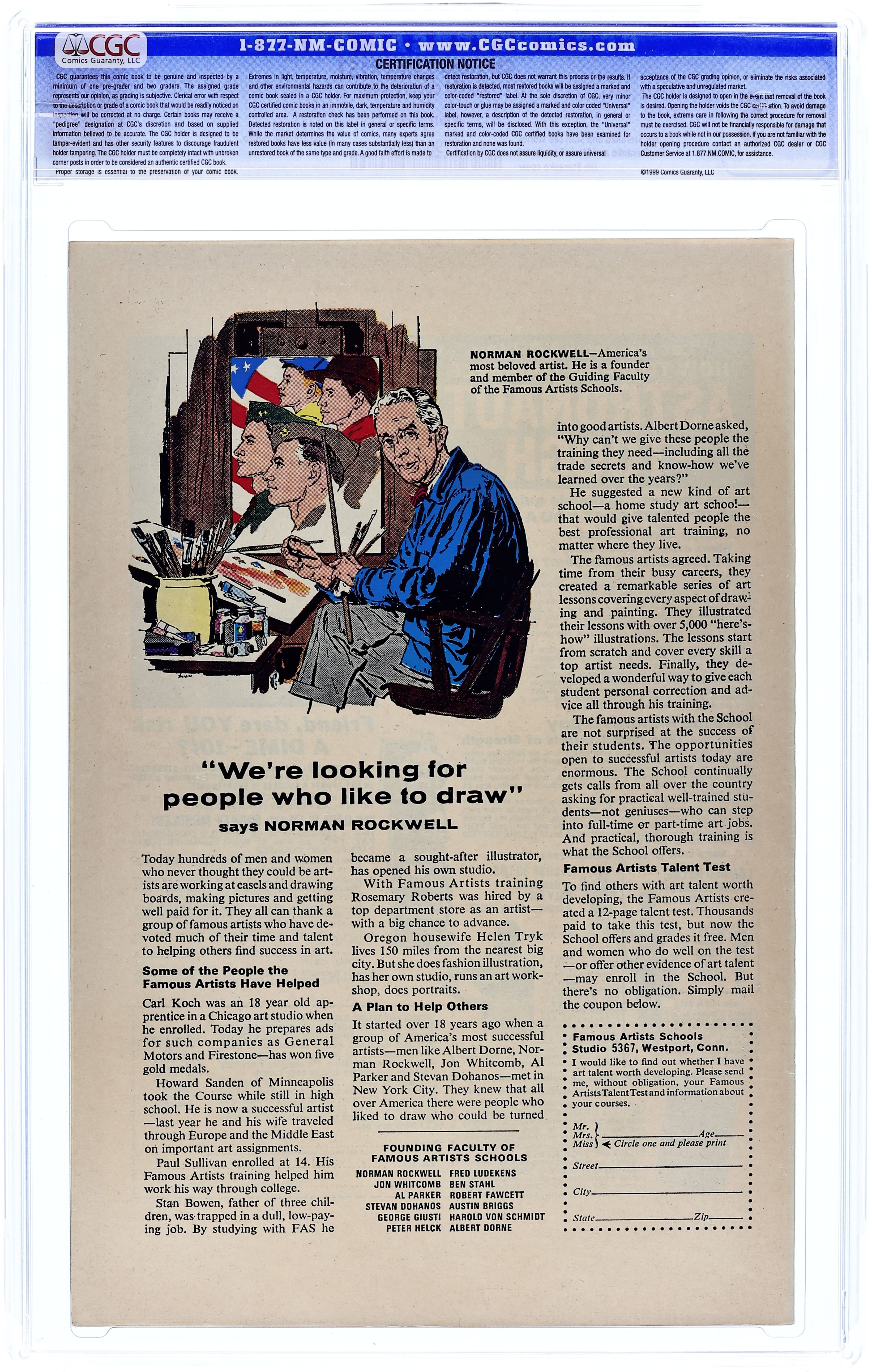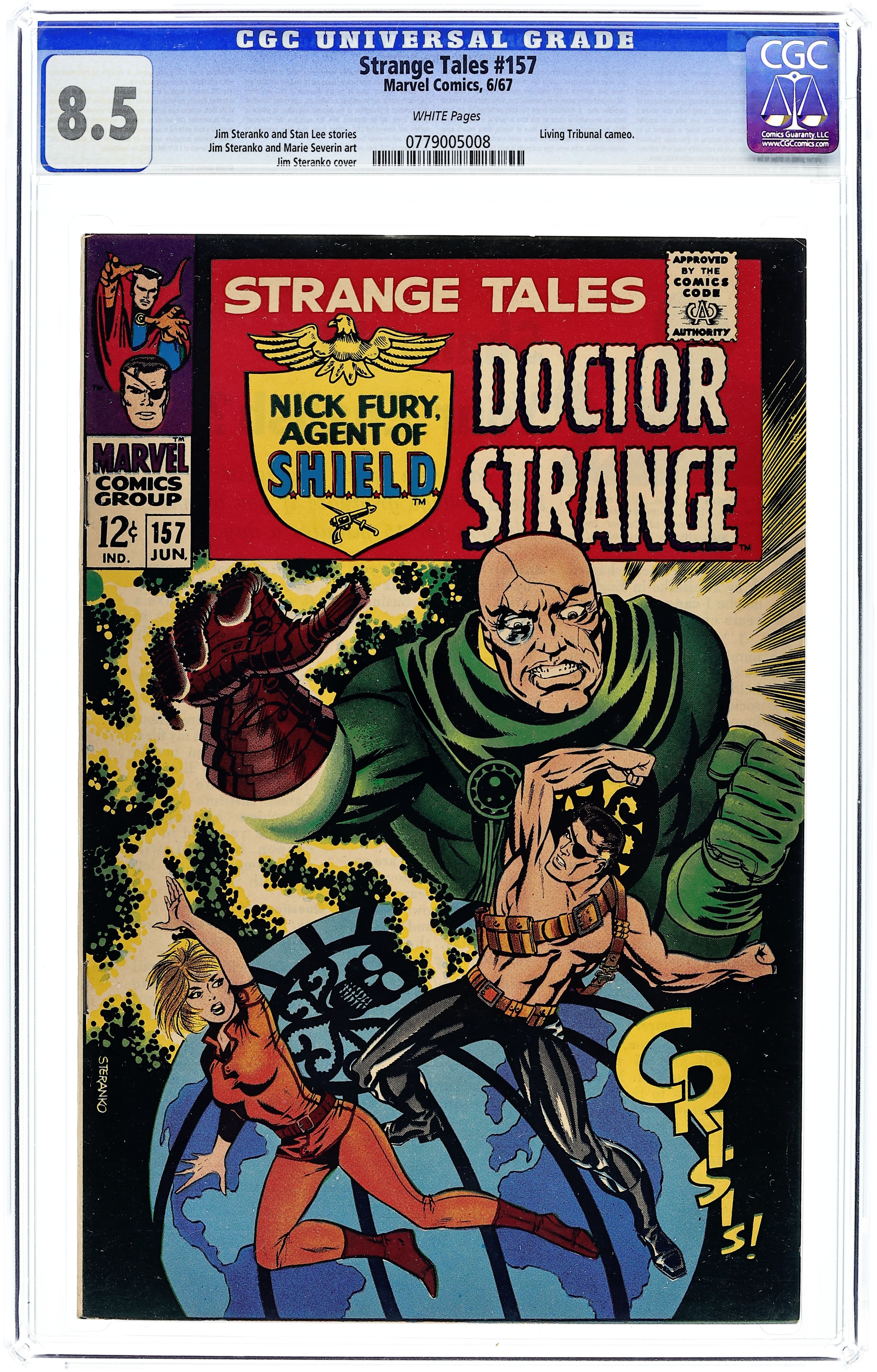 Ended Oct 15 2025 Bid History 23 bids Winning Bid $380 Cover art by Jim Steranko. Nick Fury stars in "Crisis!", script and art by Jim Steranko; Strucker announces that the impregnable dome over Hydra Island will keep them safe from the "Death Spore" plague, and plans to use Fury's body as the basis for an army of HYDRA androids to "police" the world, once he's dead from the Alpha Ray beam; But Fury escapes!; As SHIELD searches the Heli-Carrier for the bomb with no result, Fury, "playing it by ear", takes on one group of HYDRA thugs after another, until Strucker faces him one-on-one. "The End of the Ancient One!", script by Stan Lee and Marie Severin (co-plot), pencils by Marie Severin, inks by Herb Trimpe; In order to pass his powers onto his disciple, The Ancient One allows Zom to defeat him; Before Strange's eyes, his mentor is fused with one of the giant rocks at Stonehenge, but not before he utters a warning; A battle ensues; First appearance of the Living Tribunal. Merry Marvel Marching Society info and coupon. 36 pgs., full color. Cover price $0.12. Grade: CGC 8.5 explanation of grade Condition: Used (collectible)