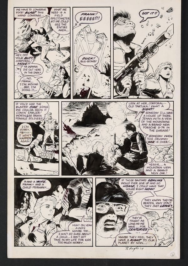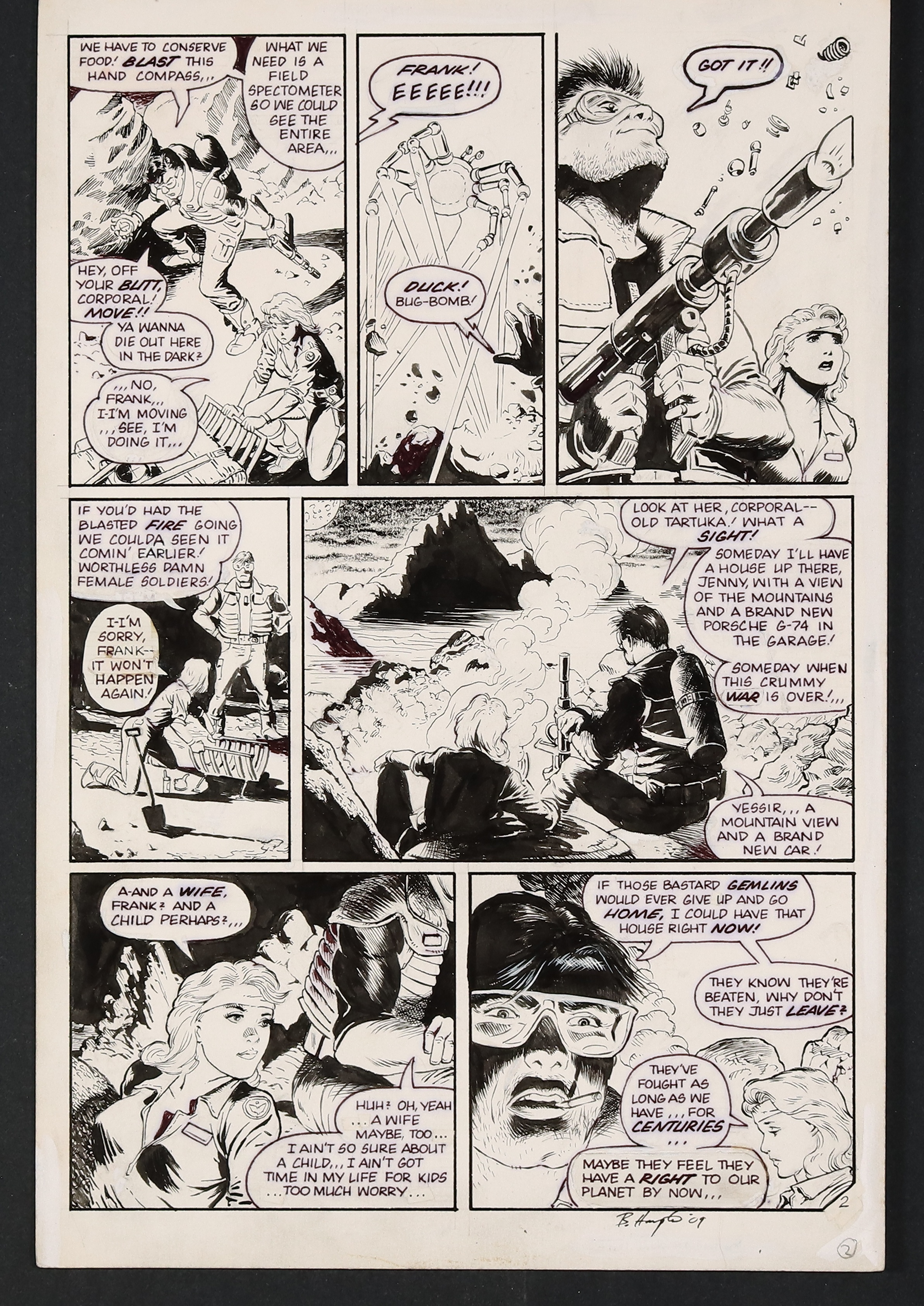 Rich, detailed panels pack this page that sees two soldiers in the mountains looking for respite from a never-ending war- a war whose nature is unclear, especially to those caught in its cycle. Signed by the artist in lower left margin. Pencil and ink on art board. 11" x 16 1/2".