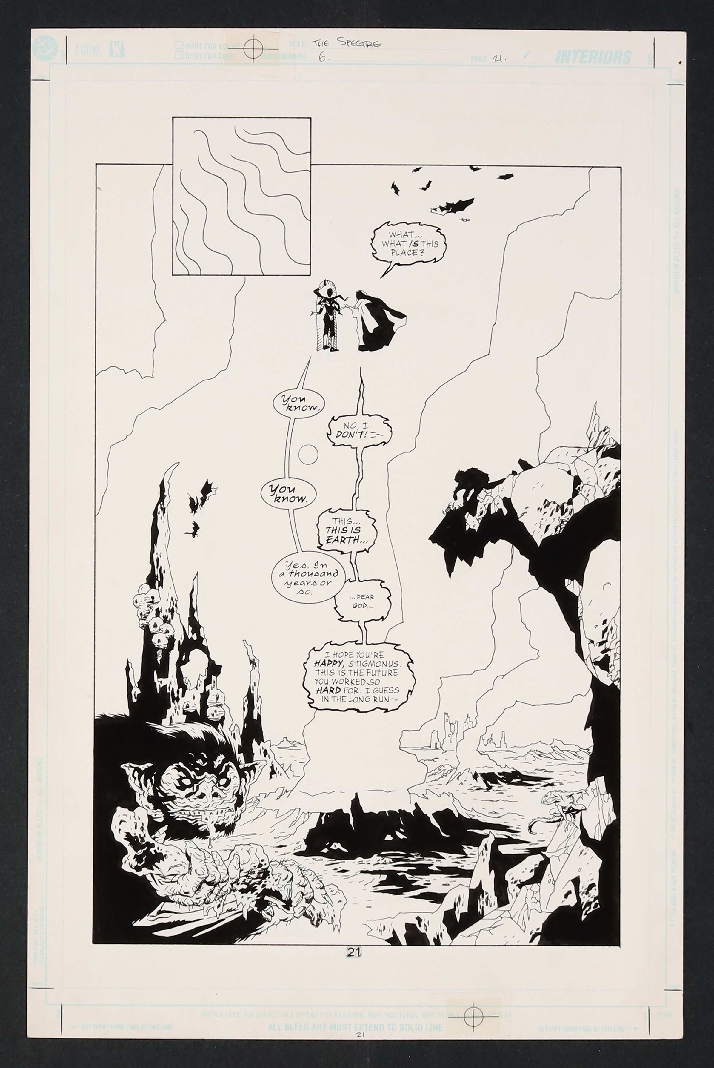 Still acclimating to his role as host to (or prisoner of, as the cover says) The Spectre, Hal Jordan is confronted by Stigmonus who shakes his faith in humanity. Troubled, Hal contacts The Risen for guidance and they show him the cursed future that now awaits earth and its inhabitants thanks to Stigmonus' influence. Pencil and ink on DC Comics art board. 11" x 17".