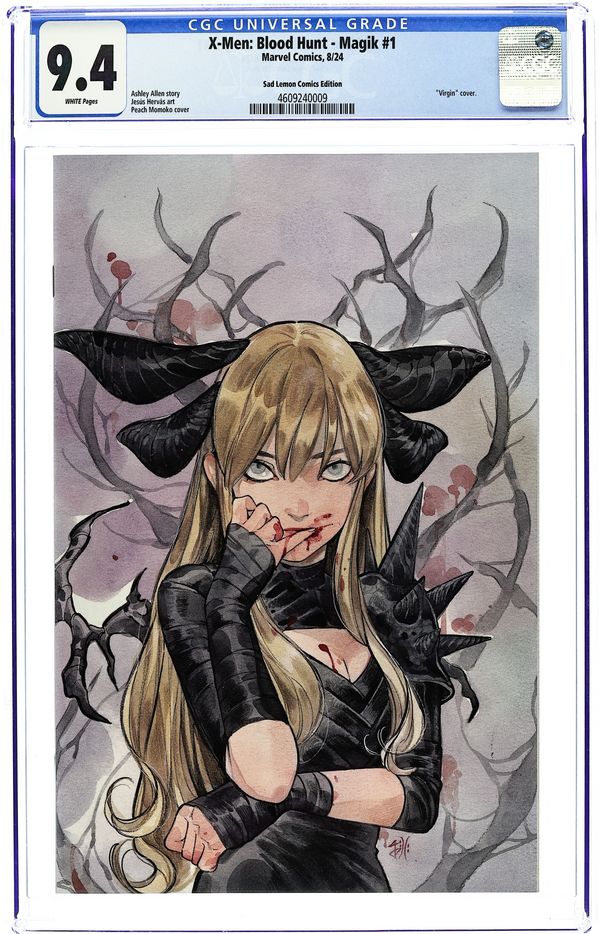 Ended Oct 27 2025 Bid History 9 bids Winning Bid $90 Sad Lemon Comics Exclusive Virgin Cover by Peach Momoko. Written by Ashley Allen. Art by Jesus Hérvas. • After the Fall of the House of X, Illyana Rasputina has returned to her homeland to search her soul and steel it for what comes next. • But how will she protect her first home when a vampire army descends on Russia, seeking to turn it into a living hell? • She may have been forged in the fires of Limbo, but has it prepared her for the Blood Hunt? 28 pages, full color. Rated T+ Cover price $3.99. Grade: CGC 9.4 explanation of grade Condition: Used (collectible)