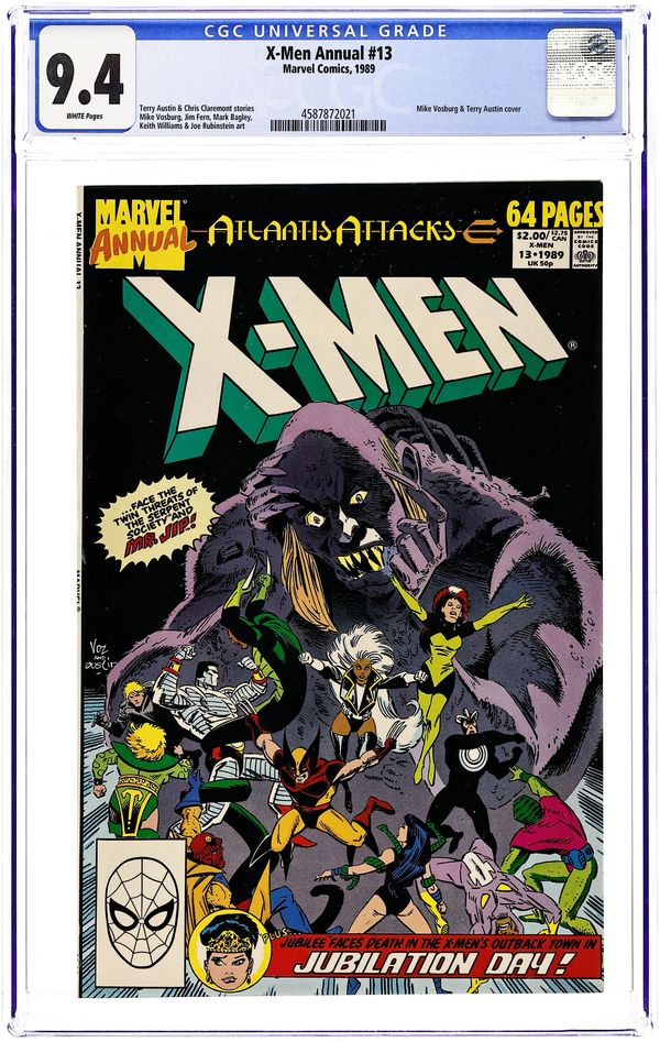 Atlantis Attacks tie-in"Double Cross" Script by Terry Austin, art by Mike Vosburg. Story continued in Amazing Spider-Man Annual 23. "Jubilation Day" Jubilee back-up story. Script by Sally Pashkow, pencils by Jim Fern, inks by Joe Rubinstein. Saga of the Serpent Crown chapter 3, "Serpent in the Garden" Script by Peter Sanderson, pencils by Mark Bagley, inks by Keith Williams. Cameo by Robert E. Howard's King Kull. Story continued in Amazing Spider-Man Annual 23 (not 24, as listed). Vosburg/Austin cover. 68 pgs. Cover price $2.00. Grade: CGC 9.4 explanation of grade Condition: Used (collectible)