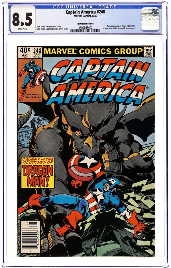 Ended Nov 17 7:55 PM CST Bid History 8 bids Winning Bid $26 Newsstand Edition. "Dragon Man!" Part 2 of 3. Plot by Roger Stern and John Byrne. Script by Roger Stern. Pencils by John Byrne. Inks by Joe Rubinstein. Cover by John Byrne and Joe Rubinstein. After defeating the Baron von Strucker robot last issue; the shield-slinger, Nick Fury, and Dum Dum Dugan regroup and postulate about who is building high-tech robots nowadays. The unknown creator in question is Machinesmith! And he has his next robot ready to go! The master of robotics sends Dragon Man (last seen in Fantastic Four 136) to hunt down Captain America! In the meantime, Steve Rogers meets his attractive new neighbor at his Brooklyn Heights townhouse. And his life and her life will never be the same again. First (full) appearance of Bernie Rosenthal. Last 40ยข cover price. (Note: The letters page features a short essay by Roger Stern about his research and plans for the Captain America series.) 36 pages. Cover price $0.40. Grade: CGC 8.5 explanation of grade Condition: Used (collectible)