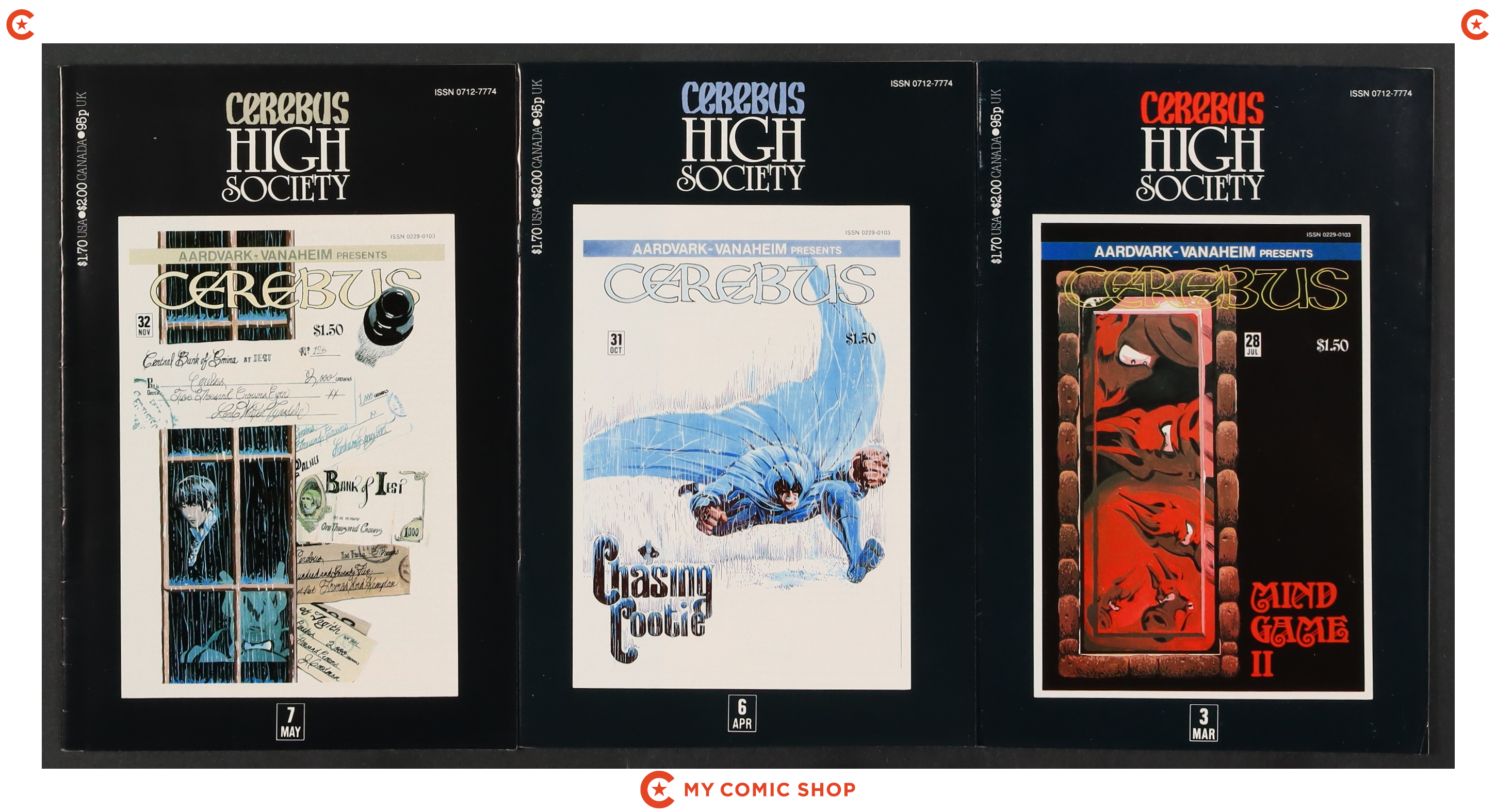 Issues 3, 6, and 7 of Cerebus High Society (1990). Most will grade in the VG to FN range.