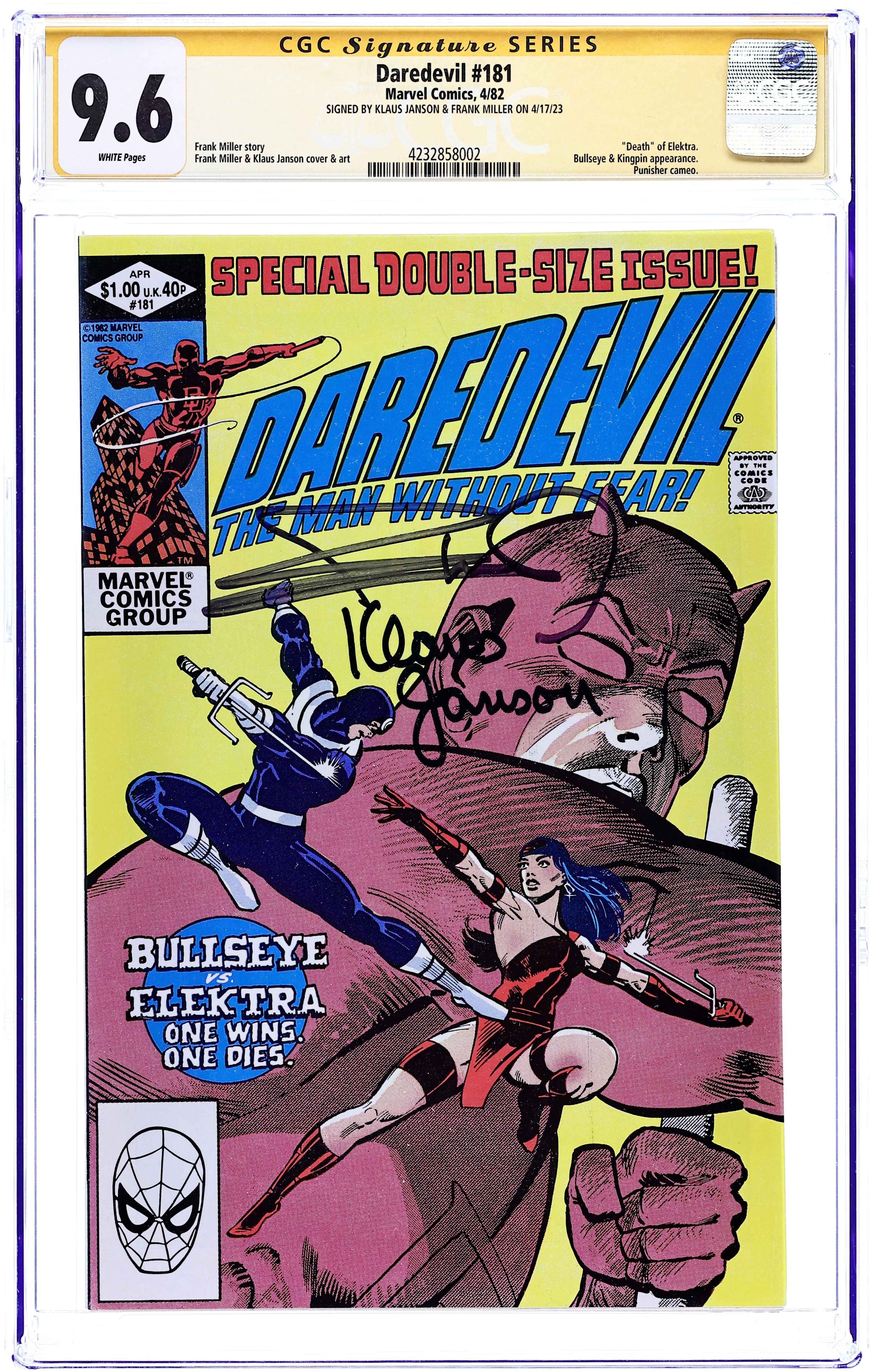Ended Sep 15 2025 Bid History 13 bids Winning Bid $299 Direct Edition. Cover pencils by Frank Miller, inks by Klaus Janson. Last Hand, script by Frank Miller, pencils by Frank Miller (breakdowns) and Klaus Janson (finished art), inks by Klaus Janson; Bullseye breaks out of prison; Elektra hunts down Foggy and is about to kill him until she recognizes him as Matt's buddy from college; Bullseye fights Elektra and kills her with her own sai; DD goes after Bullseye and ends up dropping him from a great height, breaking every bone in his body; Kingpin appearance; story narrated by Bullseye; story dedicated to the memory of Wally Wood 1927-1981. Full page pin-up ad for Marvel Fanfare, art by Michael Golden. Statement of Ownership average # of copies in preceding 12 months: 276,812 Cover price $1.00. Grade: CGC 9.6 explanation of grade Condition: Used (collectible)