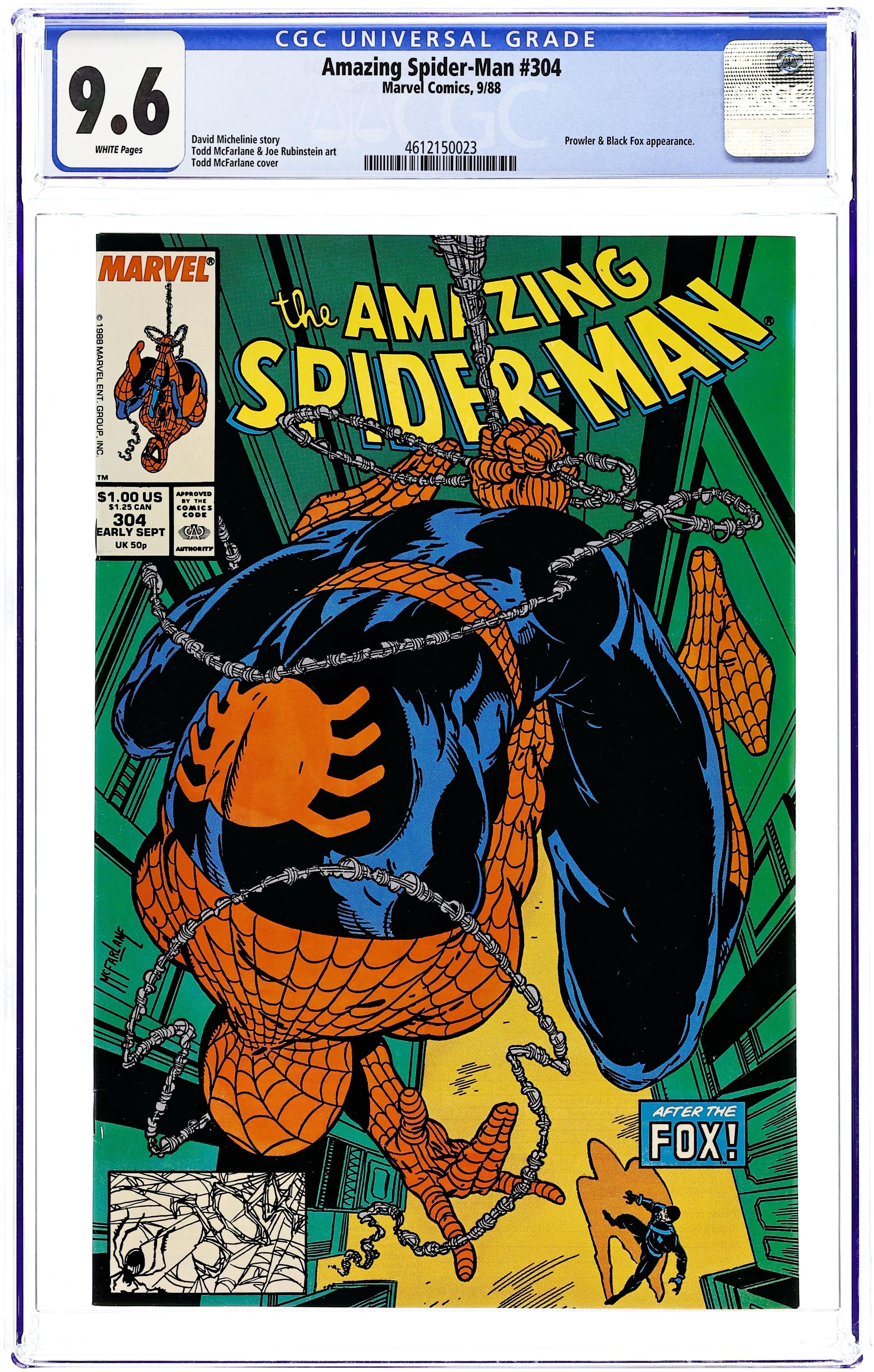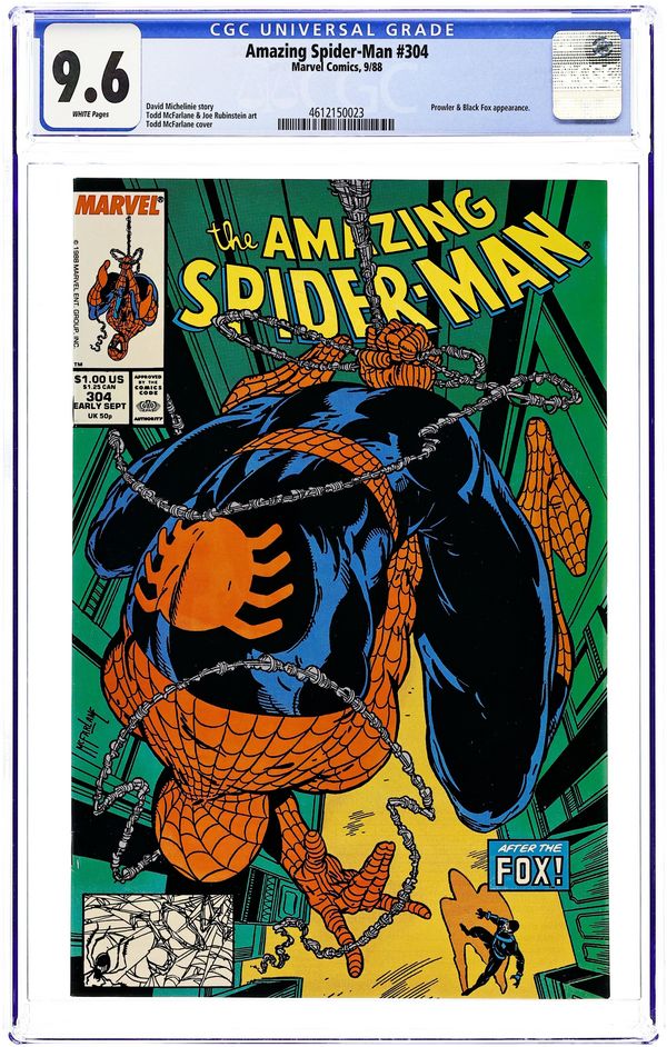Direct Edition. "California Schemin'!" Part 1 of 2. Script by David Michelinie. Pencils by Todd McFarlane. Finishes by Joe Rubinstein. Cover by Todd McFarlane. The Daily Bugle publishes a book featuring Peter Parker's best photos of Spider-Man! And now the Bugle's ace photographer and Mary Jane are on their way to Los Angeles for the publicity tour! It should be all fun in the sun in the city of angels! But Peter's first promotional event at the L.A. civic center hits a snag when an old acquaintance shows up: the Black Fox! The wily fox steals a priceless chalice and the chase is on! Is the web-slinger ready for his Hollywood debut? Cameo appearances by Aunt May, J. Jonah Jameson, and the Prowler. First appearance of Jonathan Caesar. (Notes: The Black Fox previously appeared in Web of Spider-Man 15. The Amazing Spider-Man title was published bi-monthly for the next 5 issues.) 36 pgs. Cover price $1.00. Grade: CGC 9.6 explanation of grade Condition: Used (collectible)