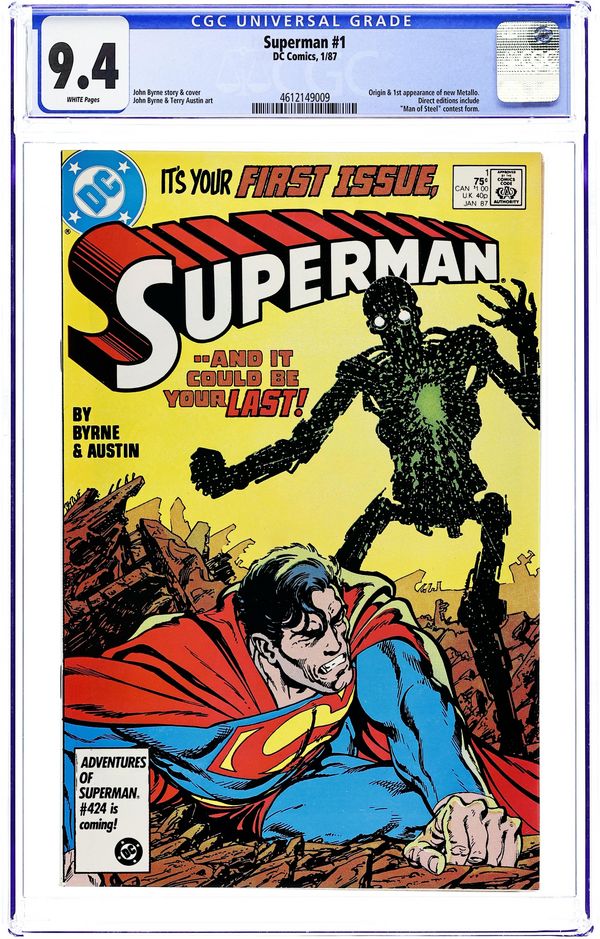 Direct Edition. "Heart of Stone!" Story by John Byrne. Art by John Byrne and Terry Austin. In the wake of Crisis on Infinite Earths, DC decides to revamp and reinvigorate their universe, and their heroes. First up, why none other than the Man of Steel himself. Superstar John Byrne, known for his acclaimed work on Marvel's Uncanny X-Men and the Fantastic Four, re-imagines the Last Son of Krypton for a whole new generation. However, Superman's first issue in this historical relaunch just may be his last as he comes face-to-face with Metallo, the Man with the Kryptonite Heart! Featuring Lois Lane. NOTE: Also see Man of Steel (1986) #1-6 for the lead in story to this series. Superman was created by Jerry Siegel and Joe Shuster. Cover price $0.75. Grade: CGC 9.4 explanation of grade Condition: Used (collectible)