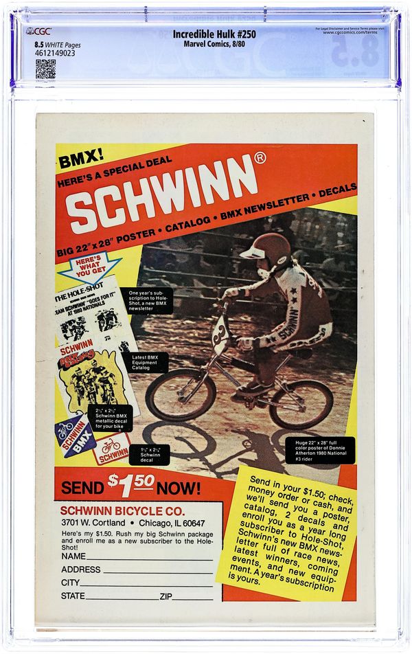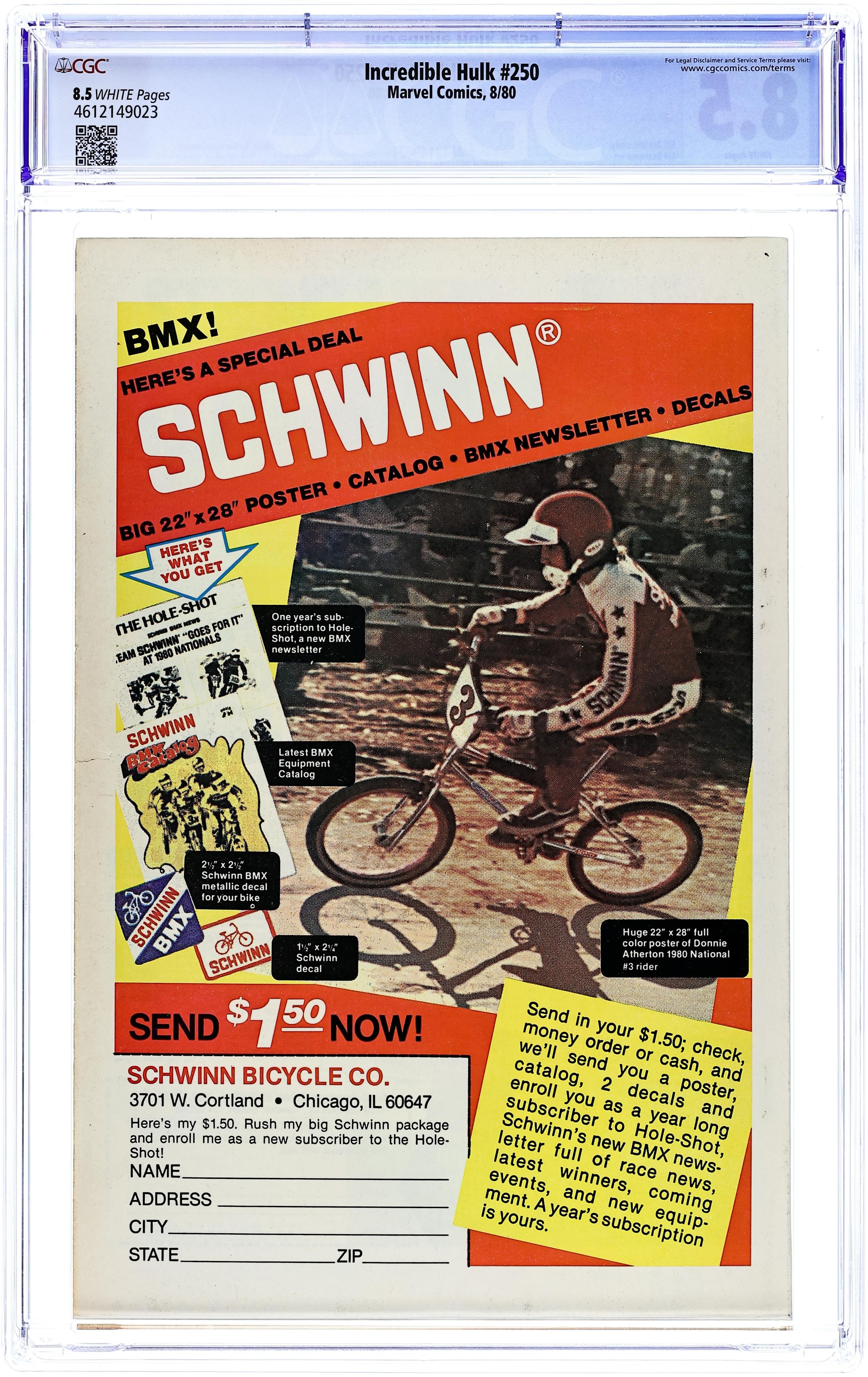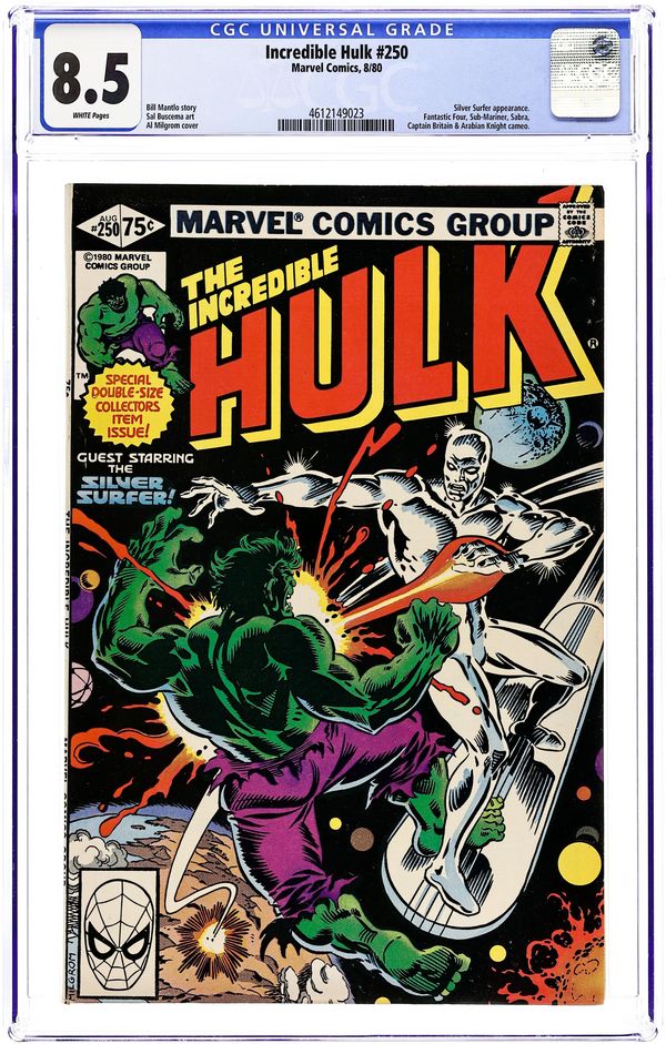 Direct Edition. Special giant-sized issue. Guest-starring Silver Surfer. A 250th celebration brought to you by Bill Mantlo and Sal Buscema. The Earth trembles when titans clash. It's the nigh unstoppable Incredible Hulk vs. the former Herald of Galactus, the Silver Surfer. Imprisoned on Earth by his former master, the Silver Surfer intends to add the immeasurable power of the Hulk to his own and break the barrier that keeps him from his home Zenn-La and his beloved. The only problem is, the Hulk has never been known for his generosity. 52 pages. Cover price $0.75. Grade: CGC 8.5 explanation of grade Condition: Used (collectible)
