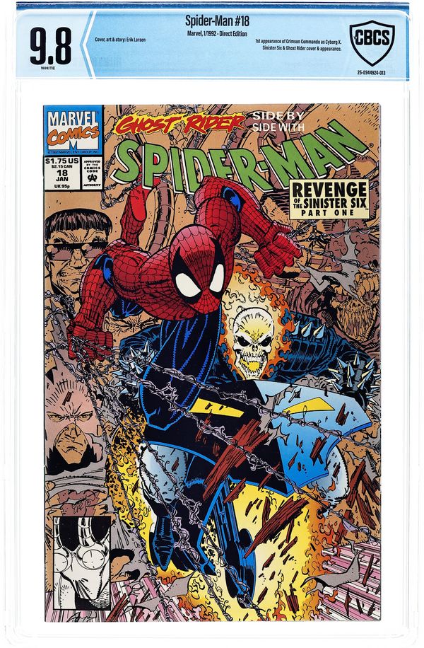 Revenge of the Sinister Six Part 1 of 6. Guest-starring Ghost Rider. Script and art by Erik Larsen. Cover by Erik Larsen. The web-slinger's next great saga starts with a bang as Spider-Man and the Ghost Rider battle a mysterious cyborg in the skies over Manhattan! The duo defeats their unknown foe and believes their caper is over, but it's only just beginning. Meanwhile, Doctor Octopus finally gets what he's wanted for a long time: adamantium arms! And no one can stop him now -- except maybe his former associates in the Sinister Six! Appearances by the Sandman, Electro, Hobgoblin (aka Demogoblin), Mysterio, and the Vulture. Cameo appearances by Mary Jane Watson and the Hulk. (Note: The Return of the Sinister Six storyline took place in Amazing Spider-Man 334-339.) 32 pages. Cover price $1.75. Grade: CBCS 9.8 explanation of grade Condition: Used (collectible)