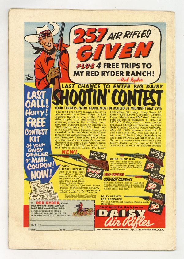 Starts Dec 22 Cover by Kurt Schaffenberger. Stories and art by Carl Pfeufer and John Jordan. Master Comics was one of the cornerstones of the Fawcett lineup during the 1940s. Captain Marvel Jr. encounters a race of mer-people, who, in grand comics tradition, wish to stay hidden from the surface world. Jungle queen Nyoka is captured by a pygmy tribe that hates outsiders, ever since their chief's ritual diamond necklace was stolen by an explorer. Western hero Tom Mix warns a rancher to move his herds out of the path of a flood, but the rancher has a hidden agenda. Captain Marvel Jr. and The Underwater Mountain Mystery; Willer the Driller: A Vacuum Bloobstutter Story; Ozzie: The Hot Rod Race of the Century; Nyoka, the Jungle Girl and the String of Pygmies; Muscle Hedd: A Big Creep!; Tom Mix: The Storm of Death. 32 pages, Full Color. Cover price $0.10. Grade: VG 4.0 explanation of grade Condition: Used (collectible)