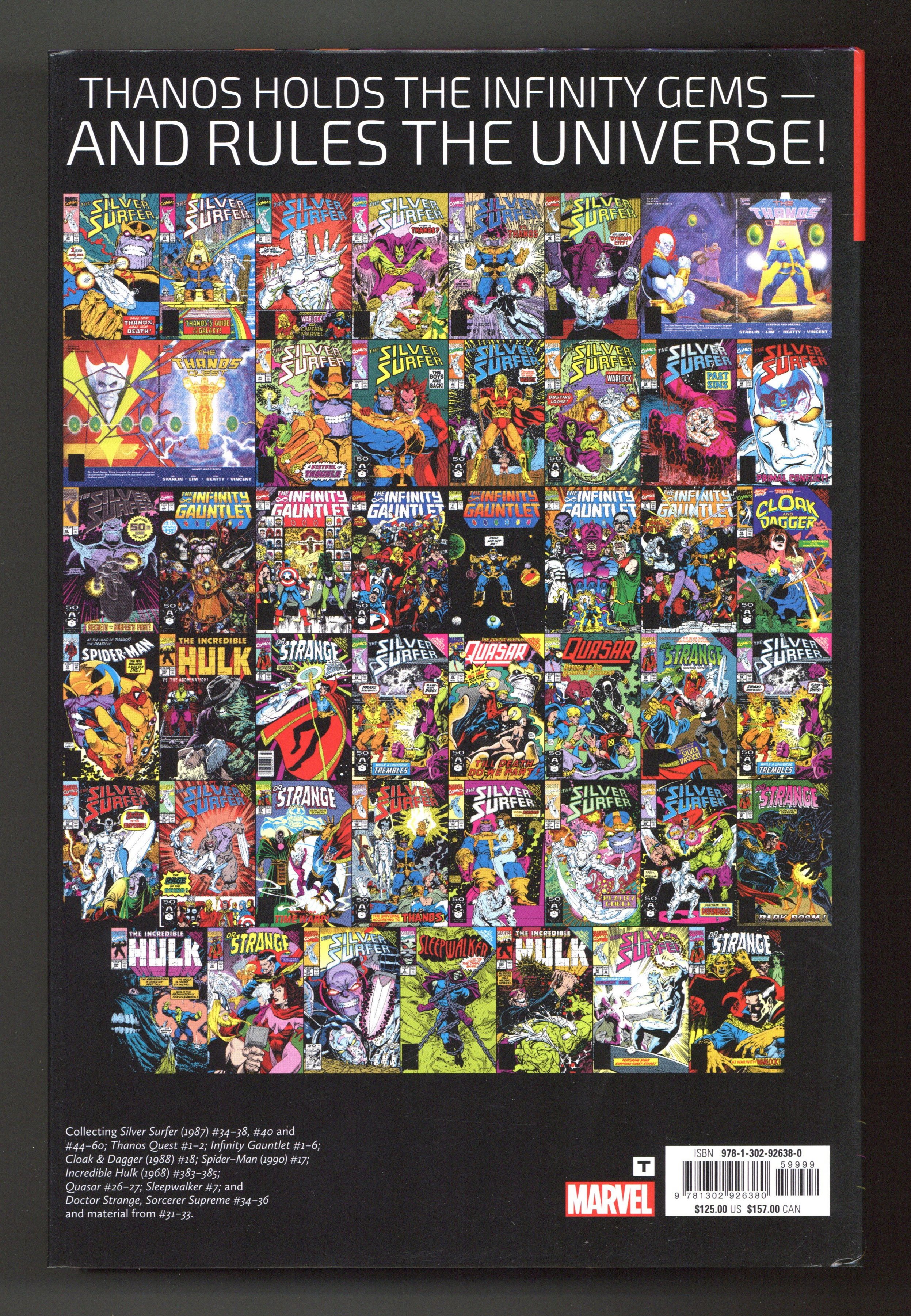 2nd Edition - 1st printing. Collects Silver Surfer (1987-1998 2nd Series) #34-38, 40 and 44-60, Thanos Quest (1990) #1-2, Infinity Gauntlet (1991) #1-6, Cloak and Dagger (1988-1991 Marvel 3rd Series) #18, Spider-Man (1990-1998) #17, Incredible Hulk (1962-1999 1st Series) #383-385, Doctor Strange (1988-1996 3rd Series) #31-36, Quasar (1989-1994) #26-27 and Sleepwalker (1991-1994) #7.
