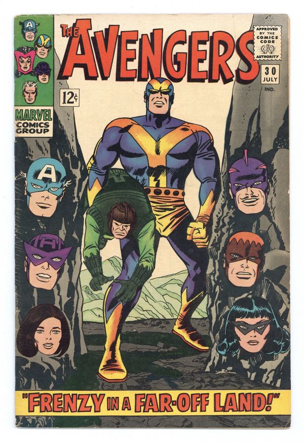 Cover pencils by Jack Kirby, inks by Frank Giacoia. "Frenzy in a Far-Off Land," script by Stan Lee, pencils by Don Heck, inks by Frank Giacoia; Quicksilver and the Scarlet Witch take a leave of absence from the Avengers due to their dwindling powers; Goliath also sets off to South America to try and find a cure, hearing his old college professor Dr. Anton is there; Black Widow is ordered to destroy the Avengers again with the help of the Swordsman and Power Man; The Avengers find the Black Widow and co. but Hawkeye wants to go alone, as it is personal to him; Meanwhile, Goliath lands in South America and finds Dr. Anton has been captured by the Keeper of the Flame; He tries to save him, but is overwhelmed then brought to safety by Prince Rey, who leads a rebel force against the Keeper; Hawkeye defeats the Swordsman but is trapped by Power Man; The Black Widow saves him, finding herself unable to harm Hawkeye as she loves him; Captain America and the Wasp leave to help Goliath. Avengers roll call: Captain America, Hawkeye, Goliath, the Wasp, and, briefly, Quicksilver and the Scarlet Witch. 36 pgs., full color. $0.12. Cover price $0.12. Grade: VG 4.0 explanation of grade Condition: Used (collectible)