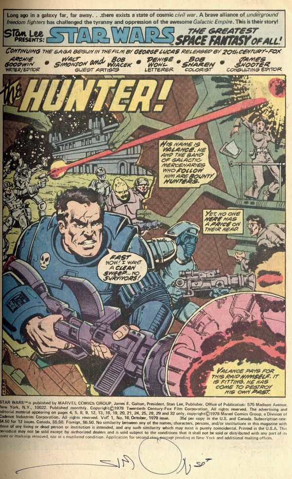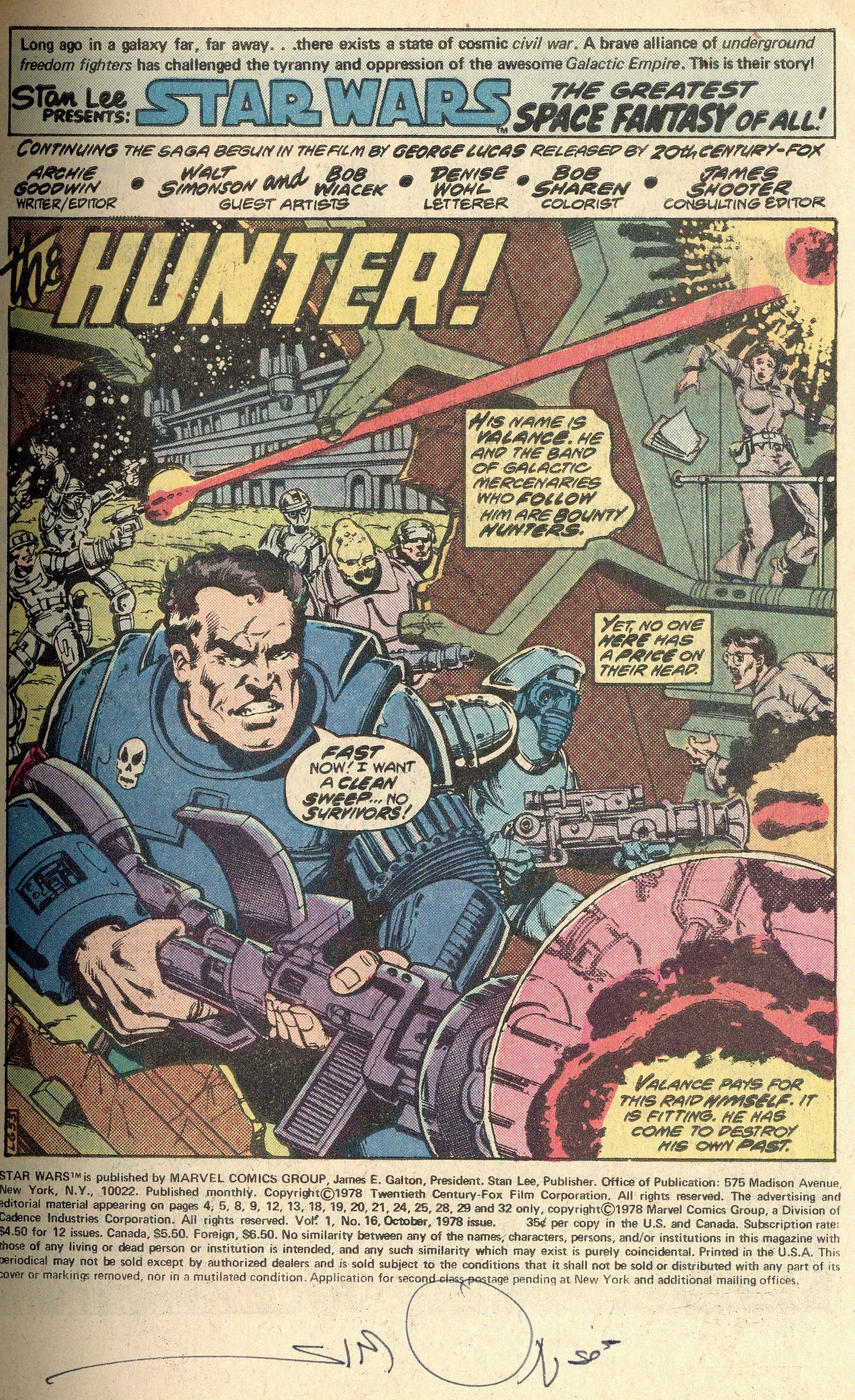 Ended Sep 8 2025 Bid History 7 bids Winning Bid $12 "The Hunter!" Written by Archie Goodwin. Art and cover by Walt Simonson and Bob Wiacek. Luke, Han, and the other heroes of Star Wars have just been targeted by one of the deadliest bounty-hunters in the galaxy - Valance the Hunter. What is this assassin's secret that makes him so dangerous? The answer may shock you. Cover price $0.35. Grade: VG+ 4.5 explanation of grade Condition: Used (collectible)